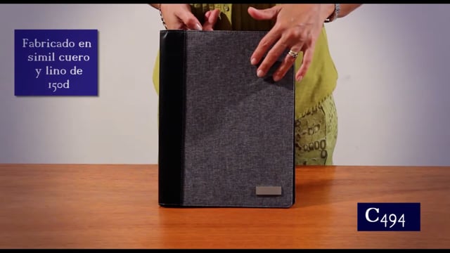 24 x 31 (cerrado). 48 x 31 (abierto). Lino 150D. Placa metálica para grabado (Medida: 5x2cm). Interior plástico. Con porta tarjetas y porta Bolígrafos elásticos. Bloc tamaño A-4 con 20 hojas blancas.