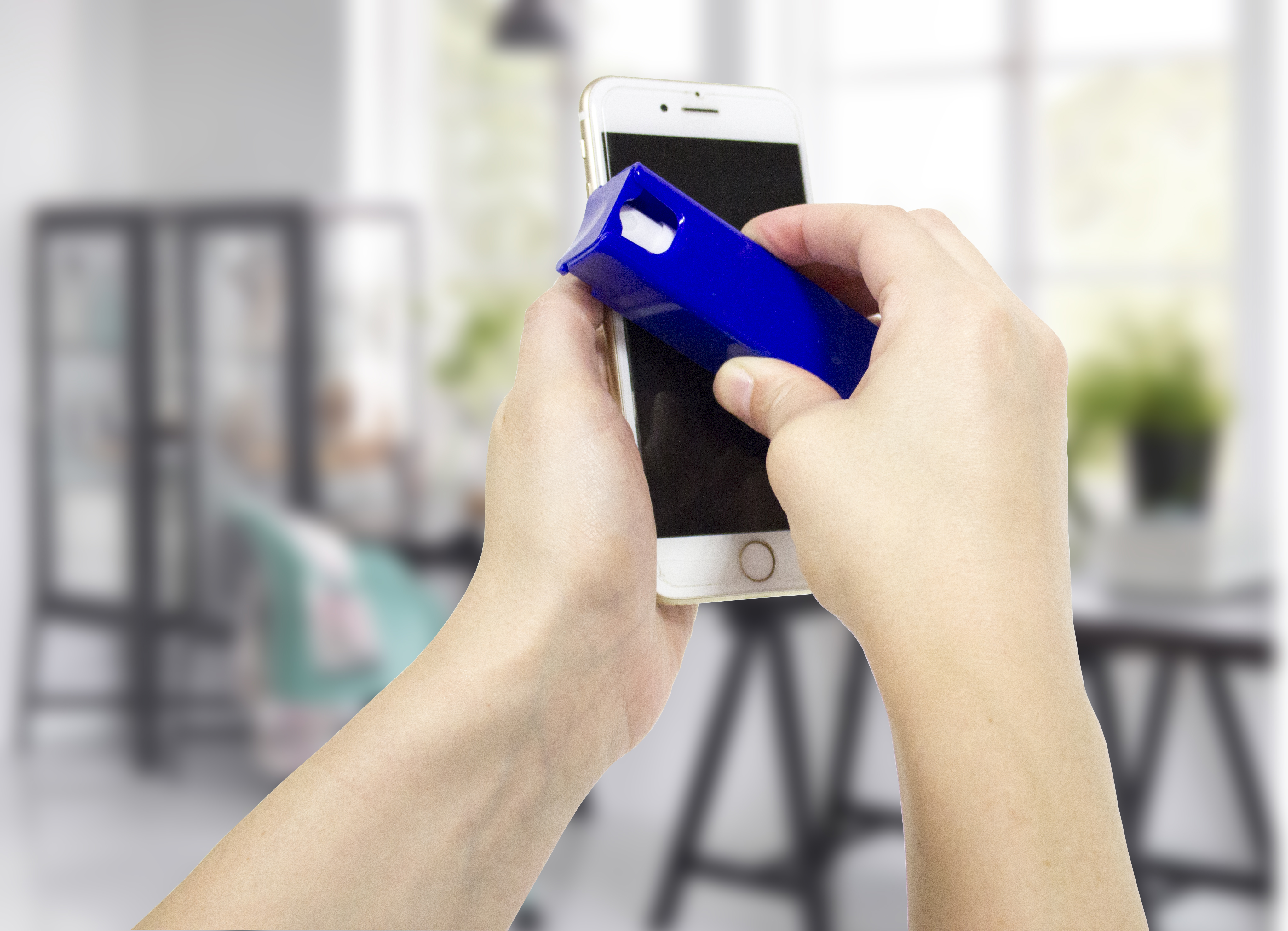 8,5 x 2,2 x 2,5 cm. Material plástico. Limpiador para pantalla de celulares y PC. Tiene incorporado un paño para limpieza.