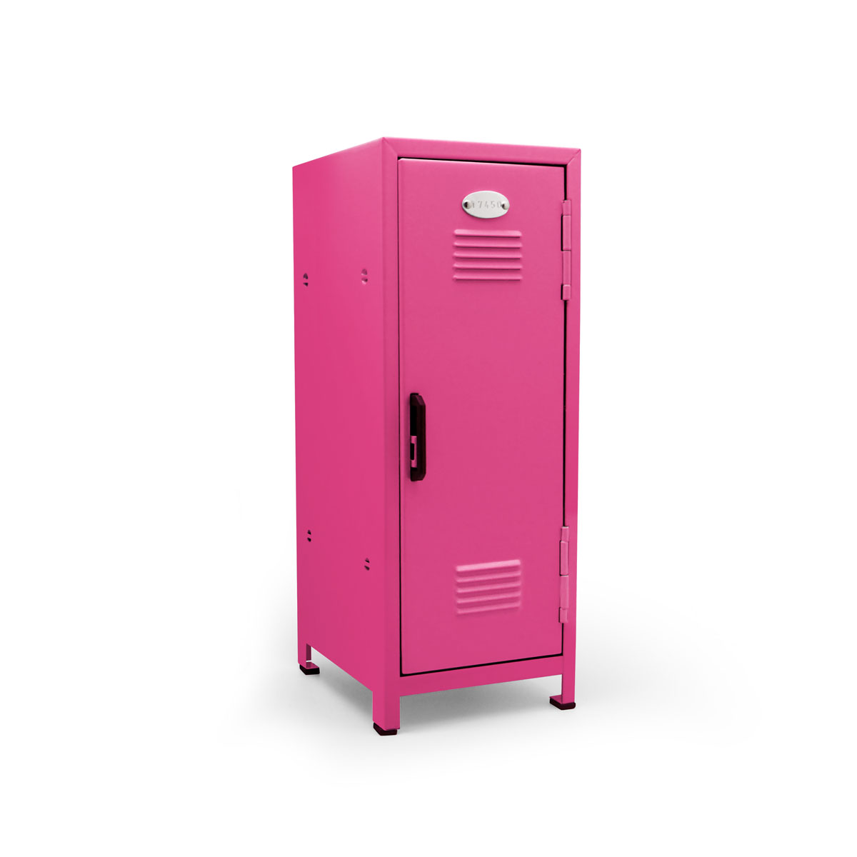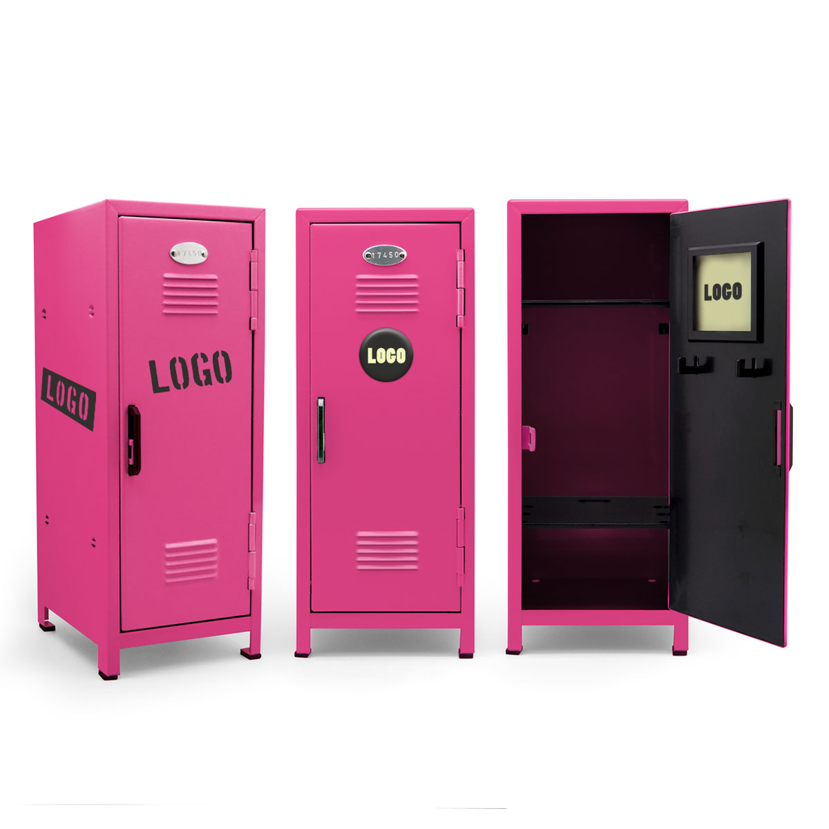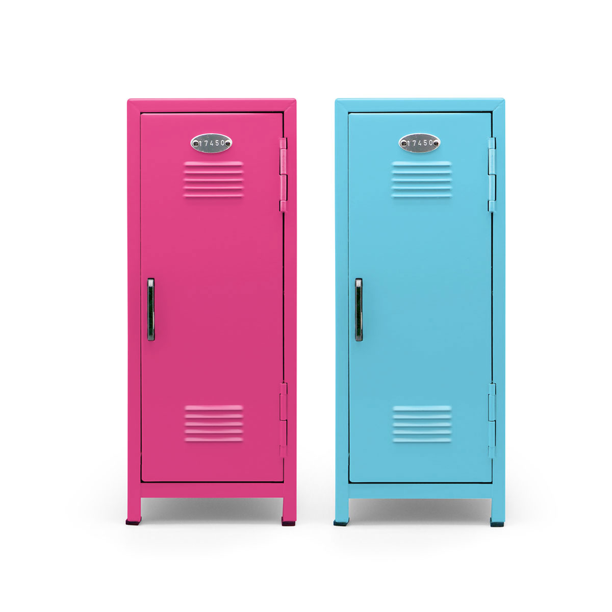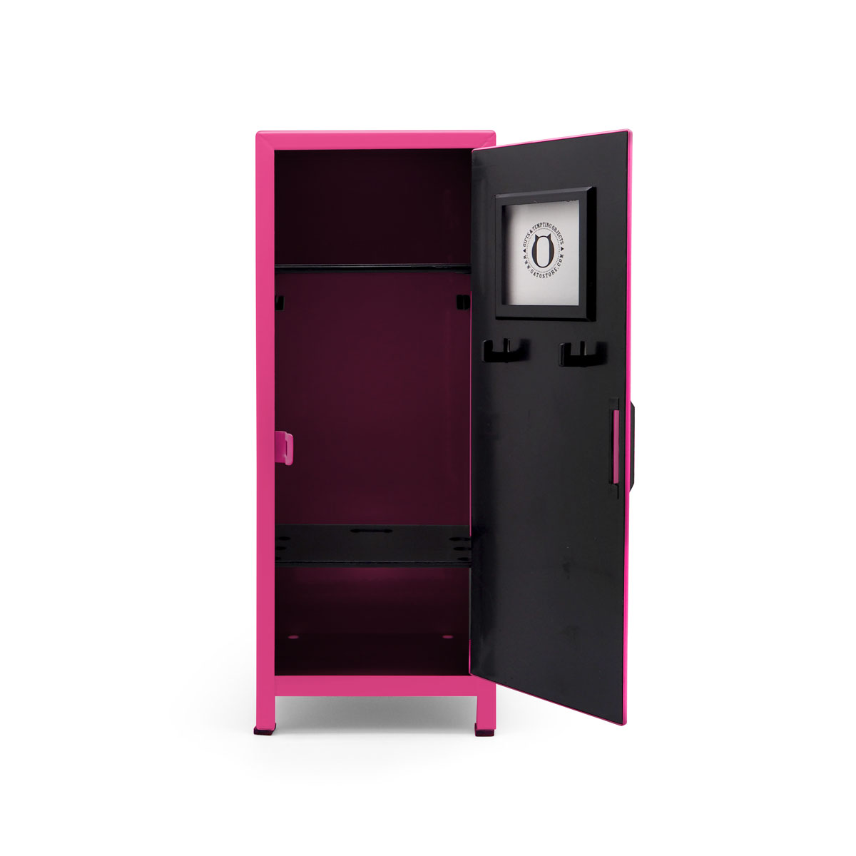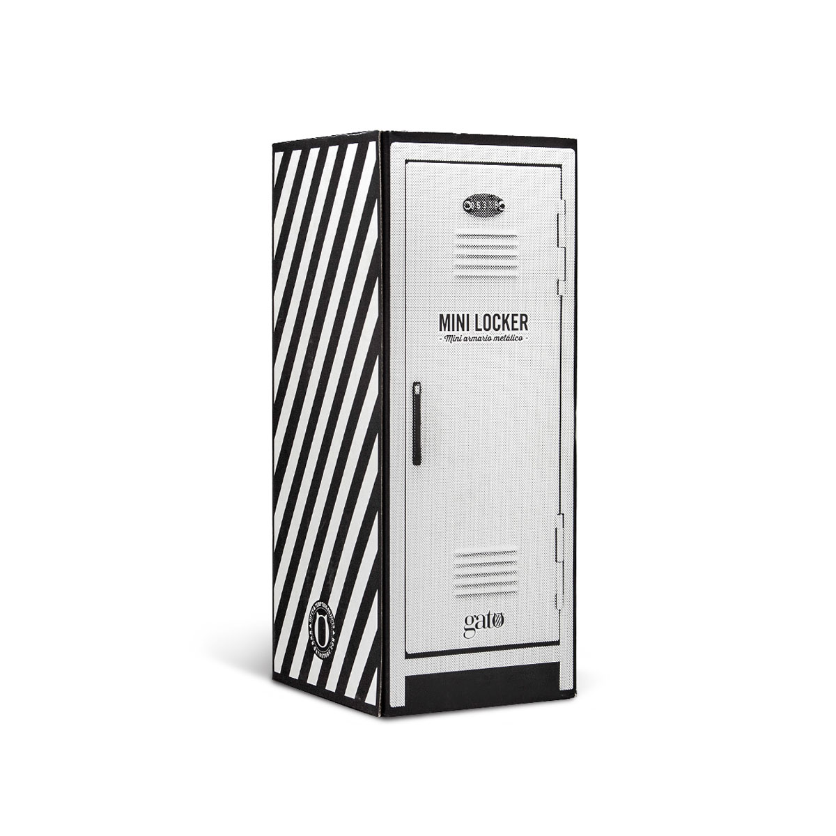 Mini armario metálico con dos estantes, candado y un conector para poder unir varios y hacer una fila. Metal. 10,5 x 27 x 10,5 cm. Ganchos interiores para colgar cosas y una placa numerada en el frente.