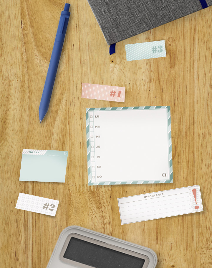 Papel de 100 gramos con adhesivo. Varias medidas. Notas adhesivas. Set ayuda memoria compuesto por 6 modelos de notas adhesivas. Presentación en caja de regalo.
