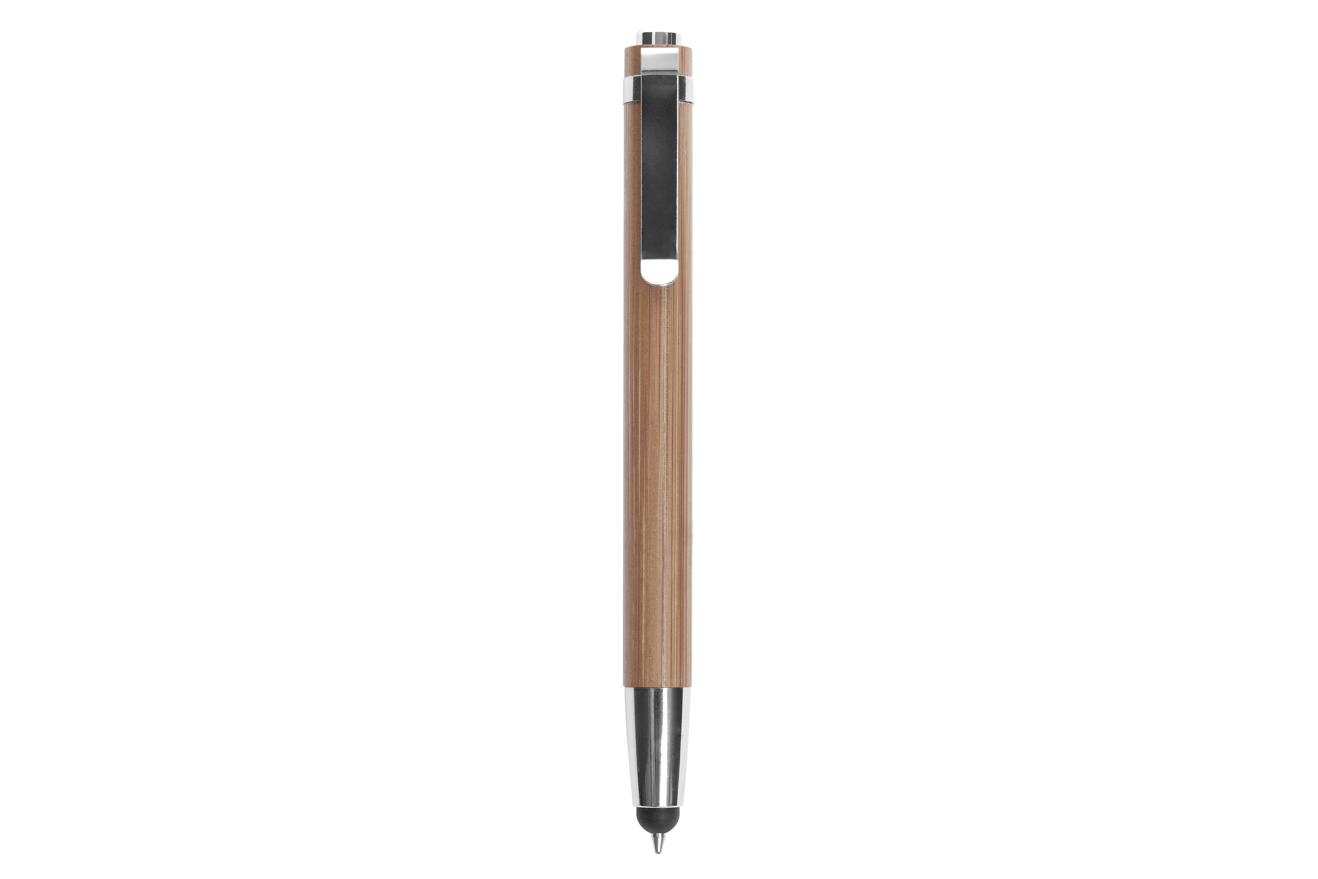 Bolígrafo de bambú con clip metálico. Puntera touch y tinta azul.
