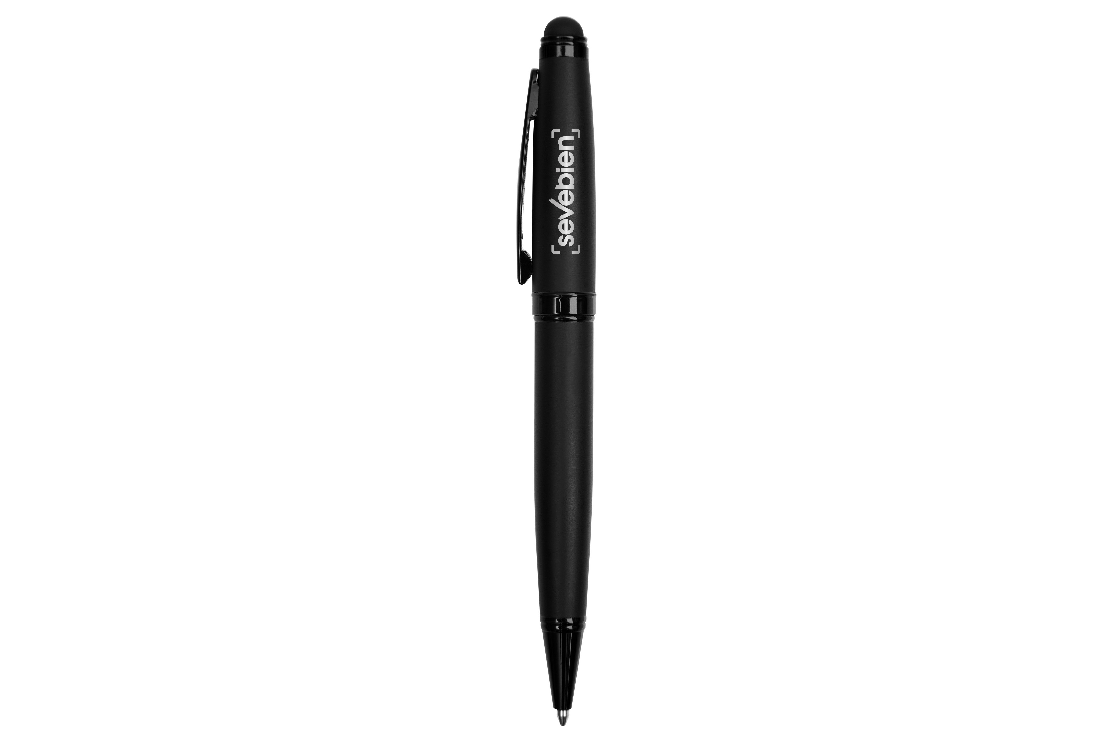 Metal. Cuerpo metálico negro mate. Clip y puntera metálicos negro brillo. Bolígrafo con puntera touch. Apertura giratoria. Tinta azul. Destape electroplateado en la parte superior. Presentación en caja de regalo.