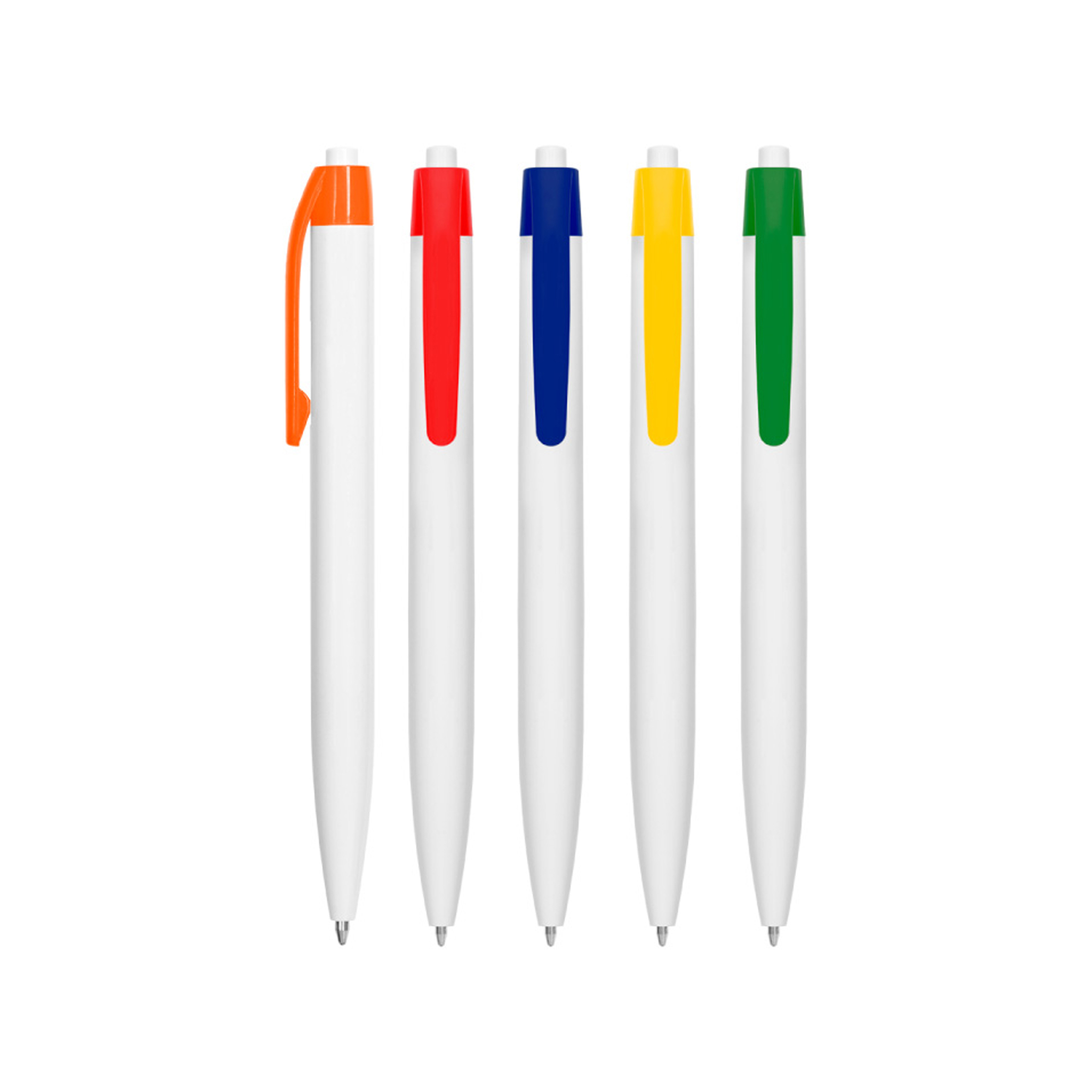 Plástico. Bolígrafo con cuerpo y pulsador de color blanco y clip en color. Tinta negra.