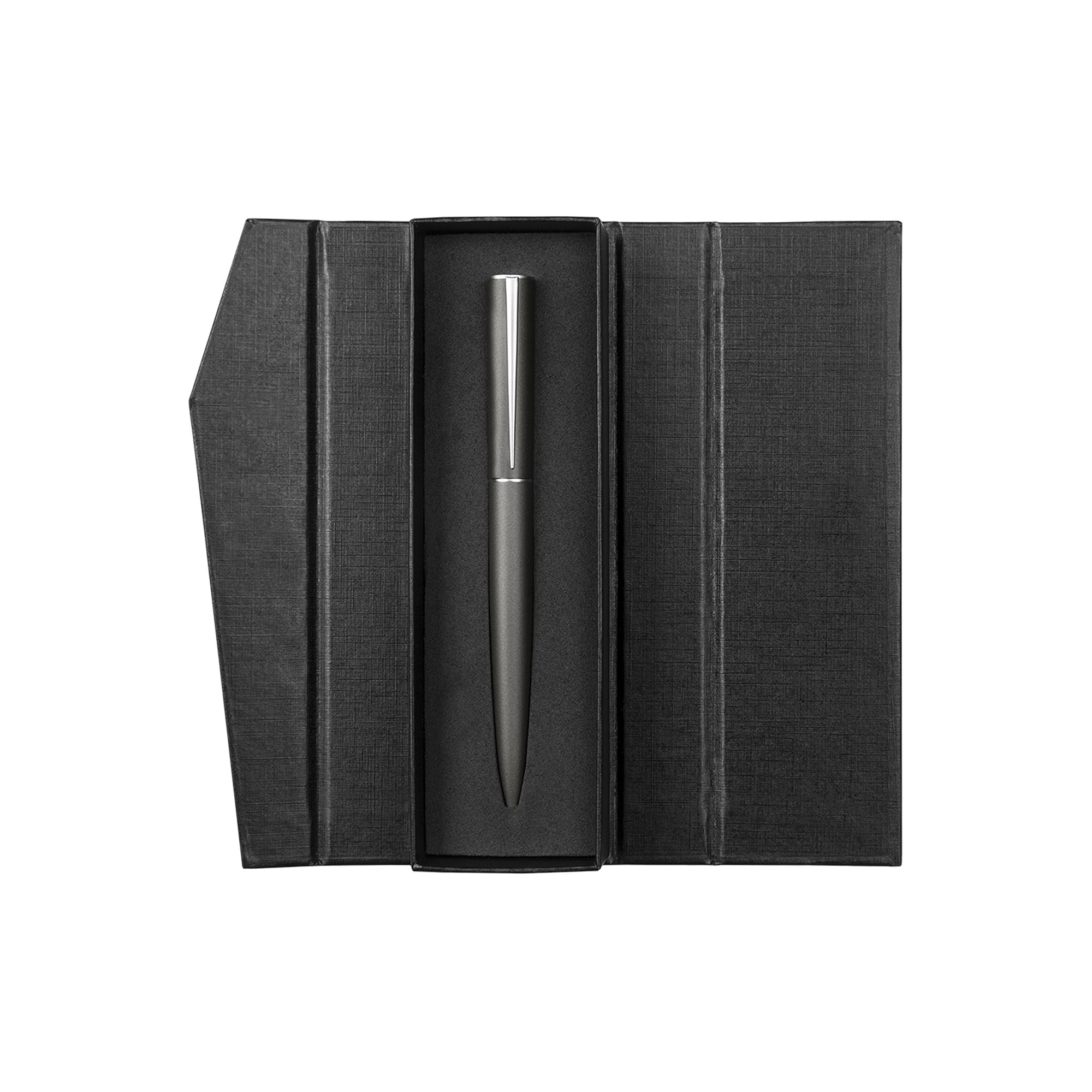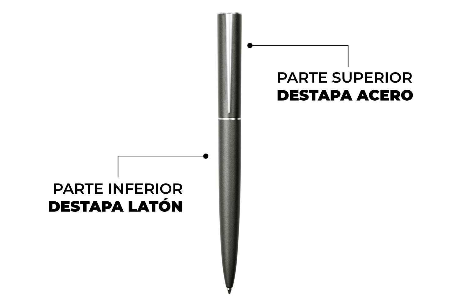 Metálico. Cuerpo color mate. Clip y anillo de acero. Apertura giratoria. Parte superior destapa acero. Parte inferior destapa dorado. Estuche de cartón. Tinta negra. Presentación en estuche con cierre magnético.