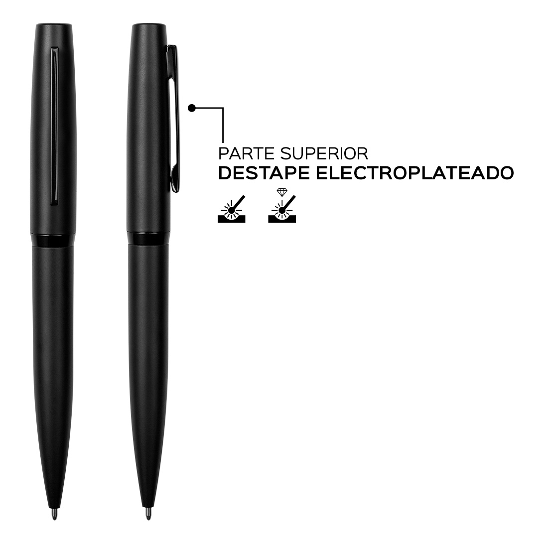 Metálico. Cuerpo color mate. Clip y anillo metálico. Apertura giratoria. Tinta azul. Presentación en caja de regalo.