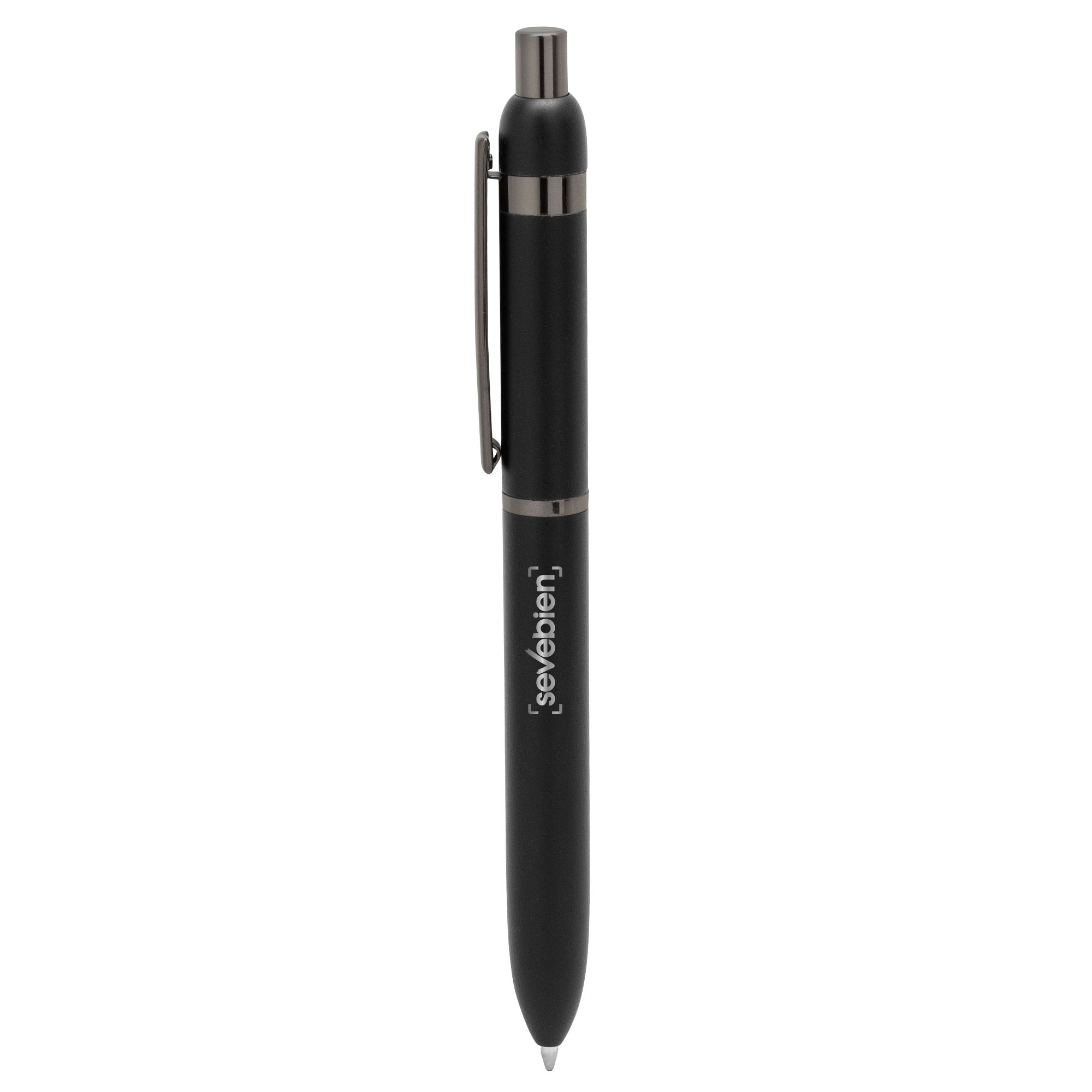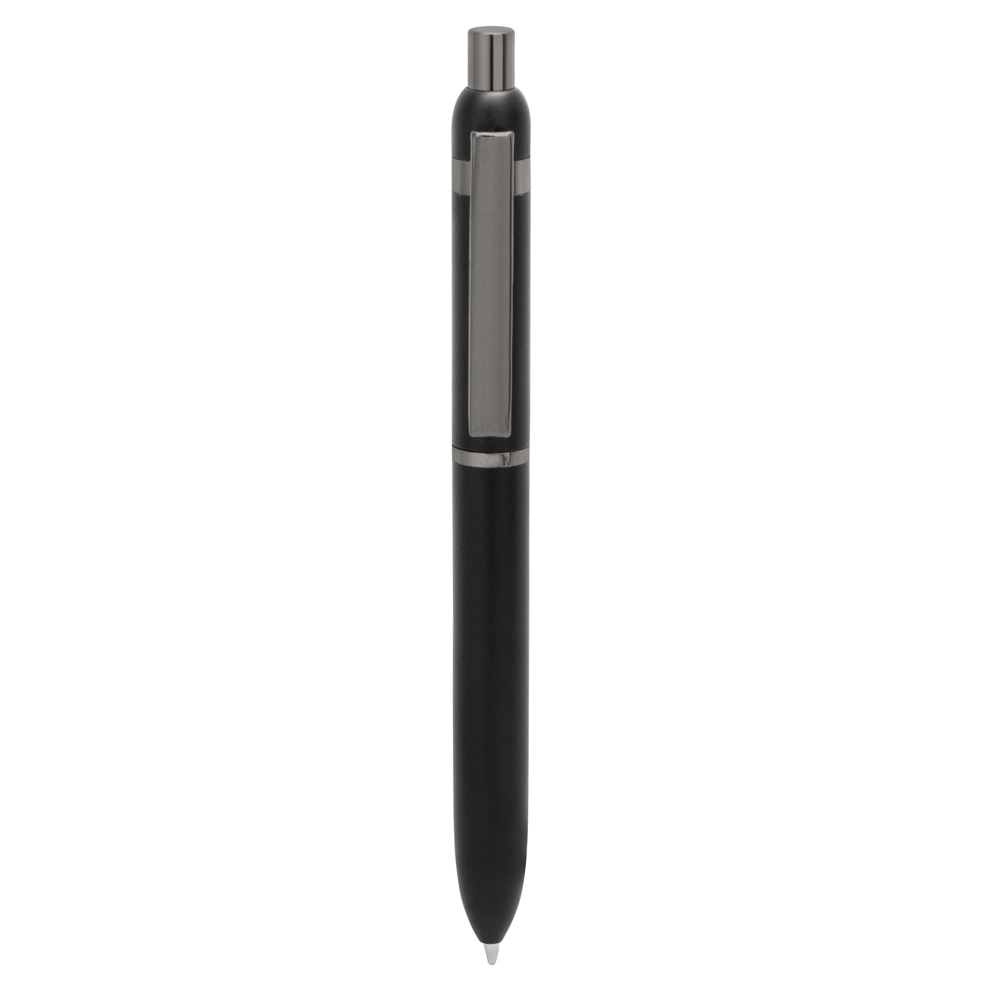 Metal. Cuerpo de aluminio. Bolígrafo retráctil. Clip, botón y anillos metálicos color plata. Tinta Azul. Destape electroplateado en ambas partes.. Presentación en estuche con cierre magnético.