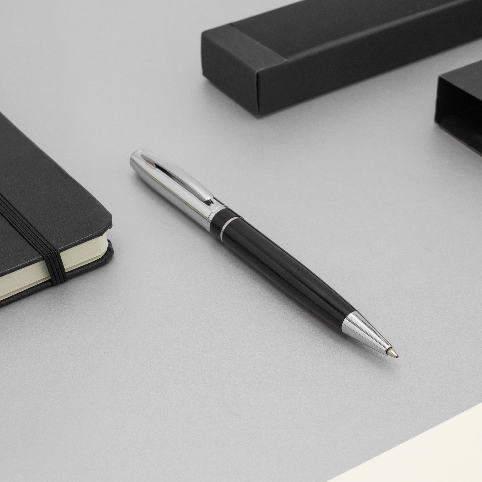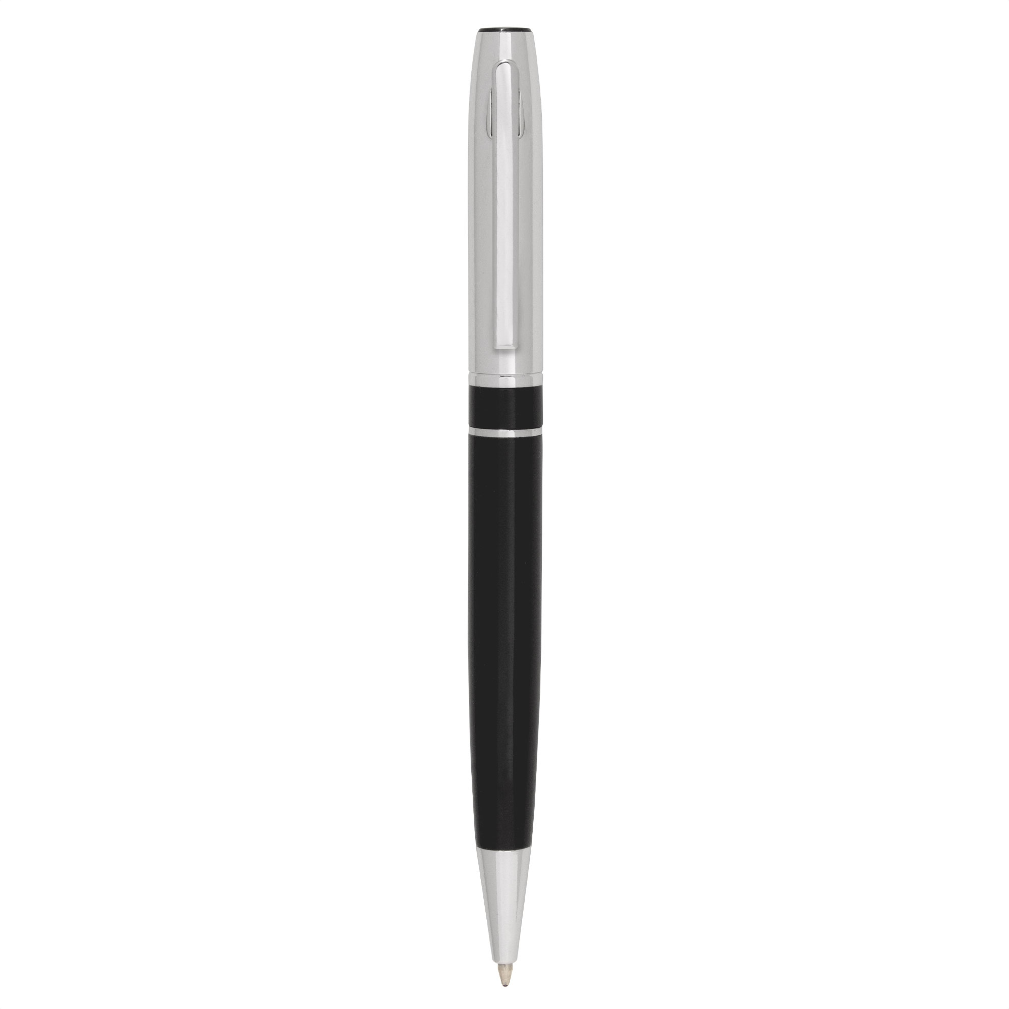 Metálico. Cuerpo color negro. Tambor superior, clip, anillo y puntera color plata. Apertura giratoria. Destape plata en la parte superior e inferior. Tinta azul. Presentación en caja de regalo.