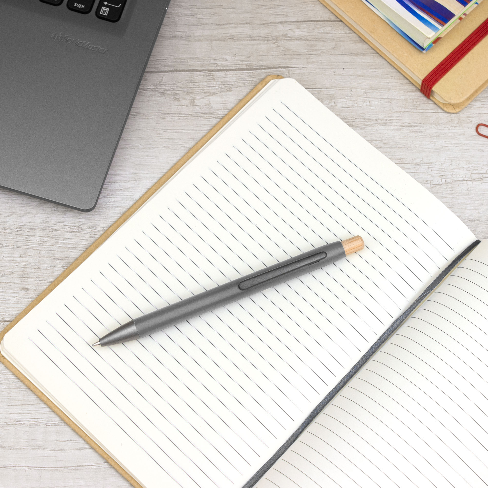 Bolígrafo retráctil. Cuerpo metálico en diferentes colores acabado mate. Clip metálico, puntera plástica color gris y pulsador de bambú.