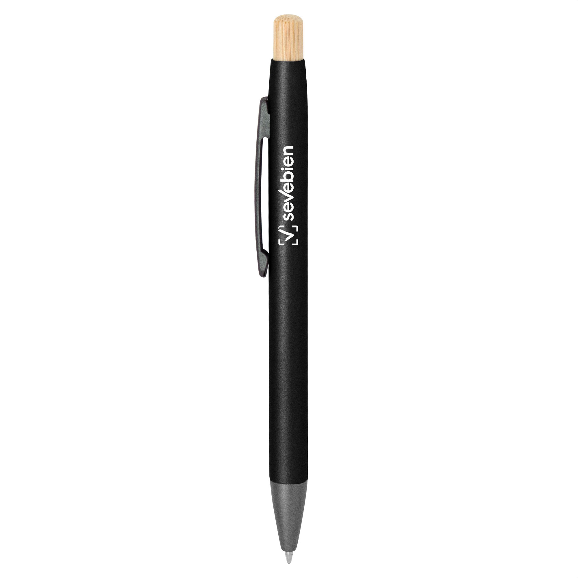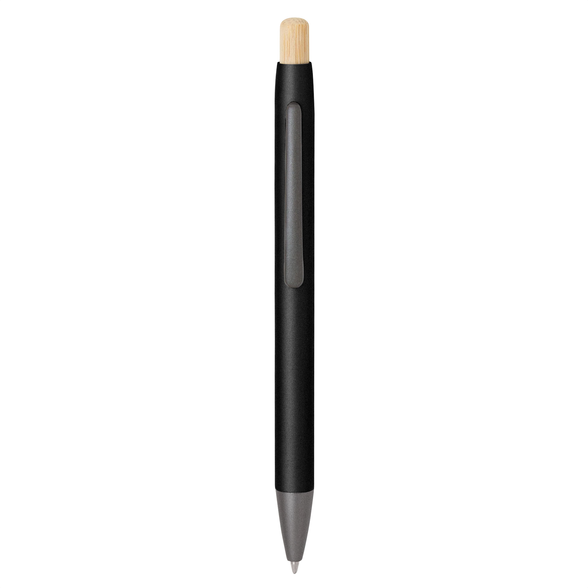 Bolígrafo retráctil. Cuerpo metálico en diferentes colores acabado mate. Clip metálico, puntera plástica color gris y pulsador de bambú.