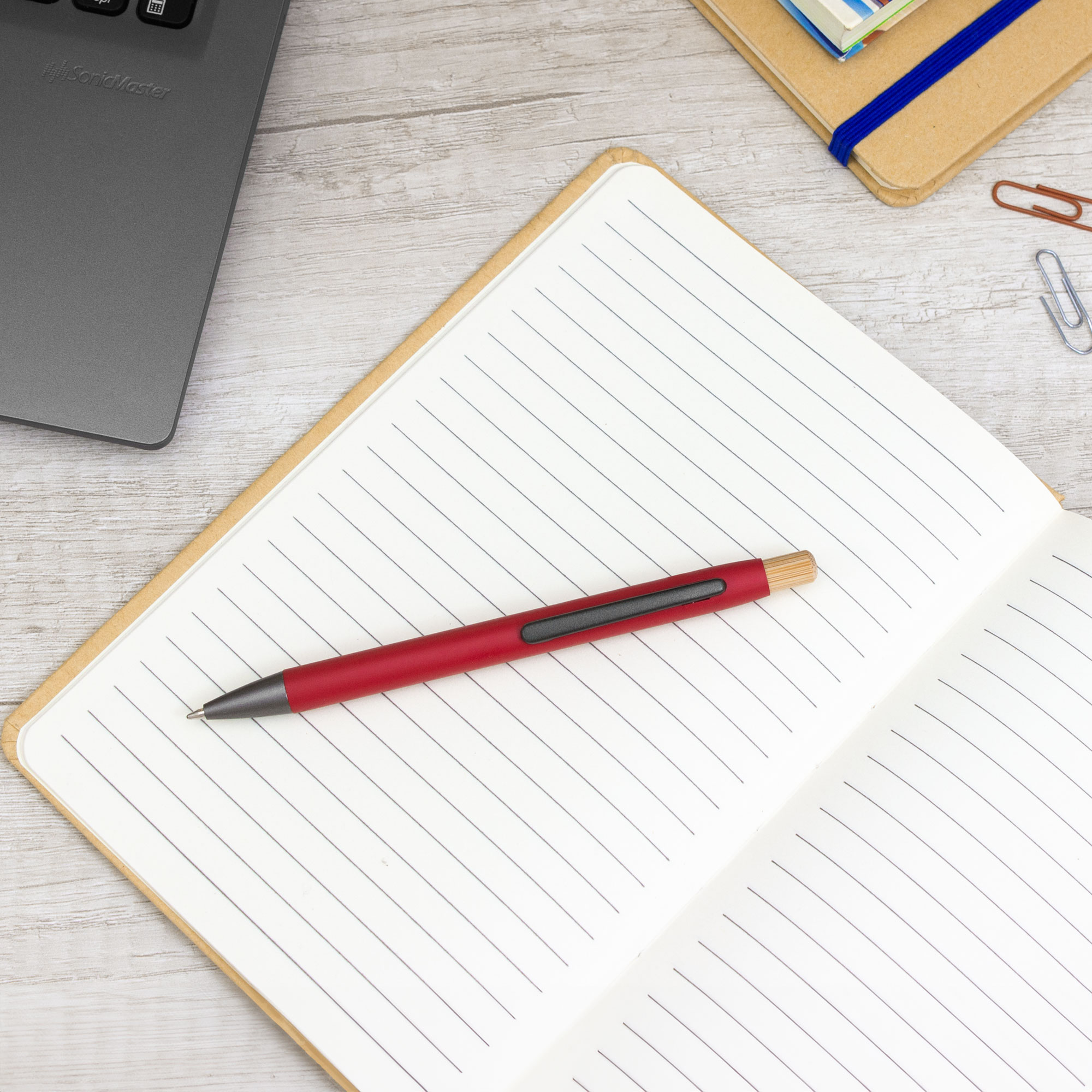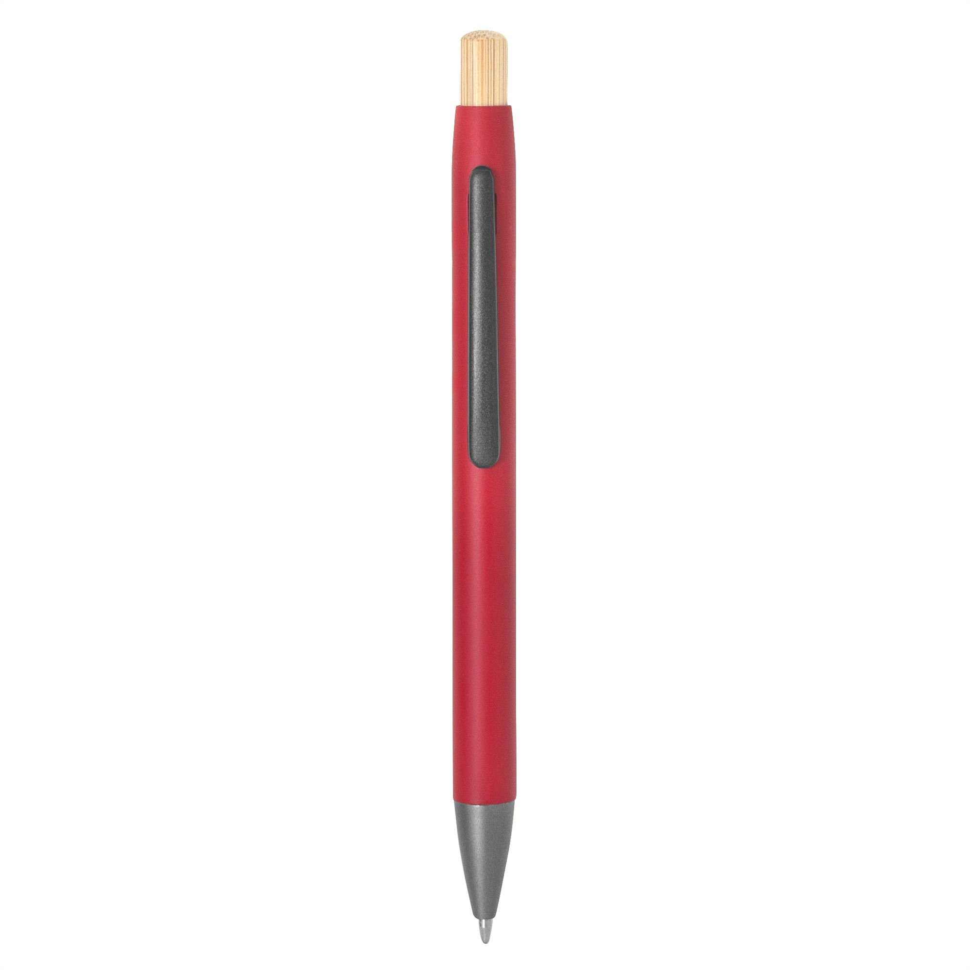 Bolígrafo retráctil. Cuerpo metálico en diferentes colores acabado mate. Clip metálico, puntera plástica color gris y pulsador de bambú.