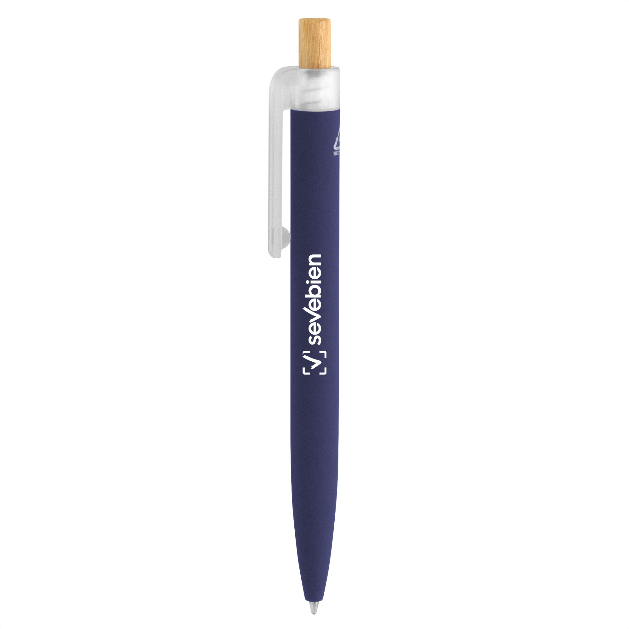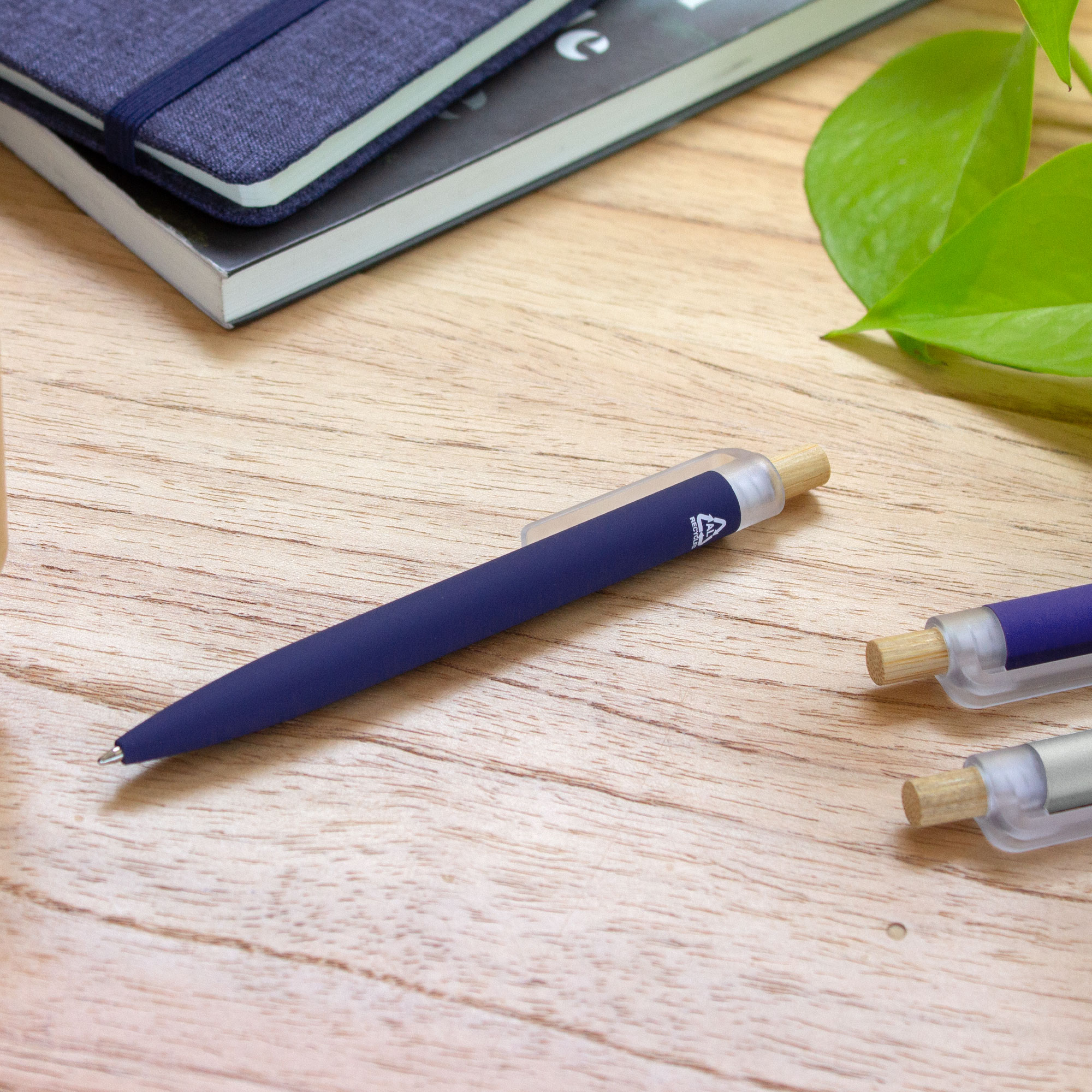 Bolígrafo retráctil. Cuerpo de aluminio en diferentes colores, acabado mate engomado, muy suave al tacto. Botón pulsador de bambú. Clip plástico transparente con terminación frosty.