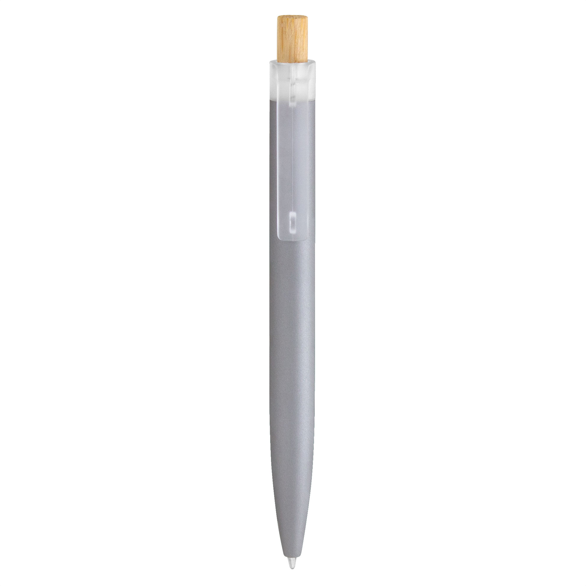 Bolígrafo retráctil. Cuerpo de aluminio en diferentes colores, acabado mate engomado, muy suave al tacto. Botón pulsador de bambú. Clip plástico transparente con terminación frosty.