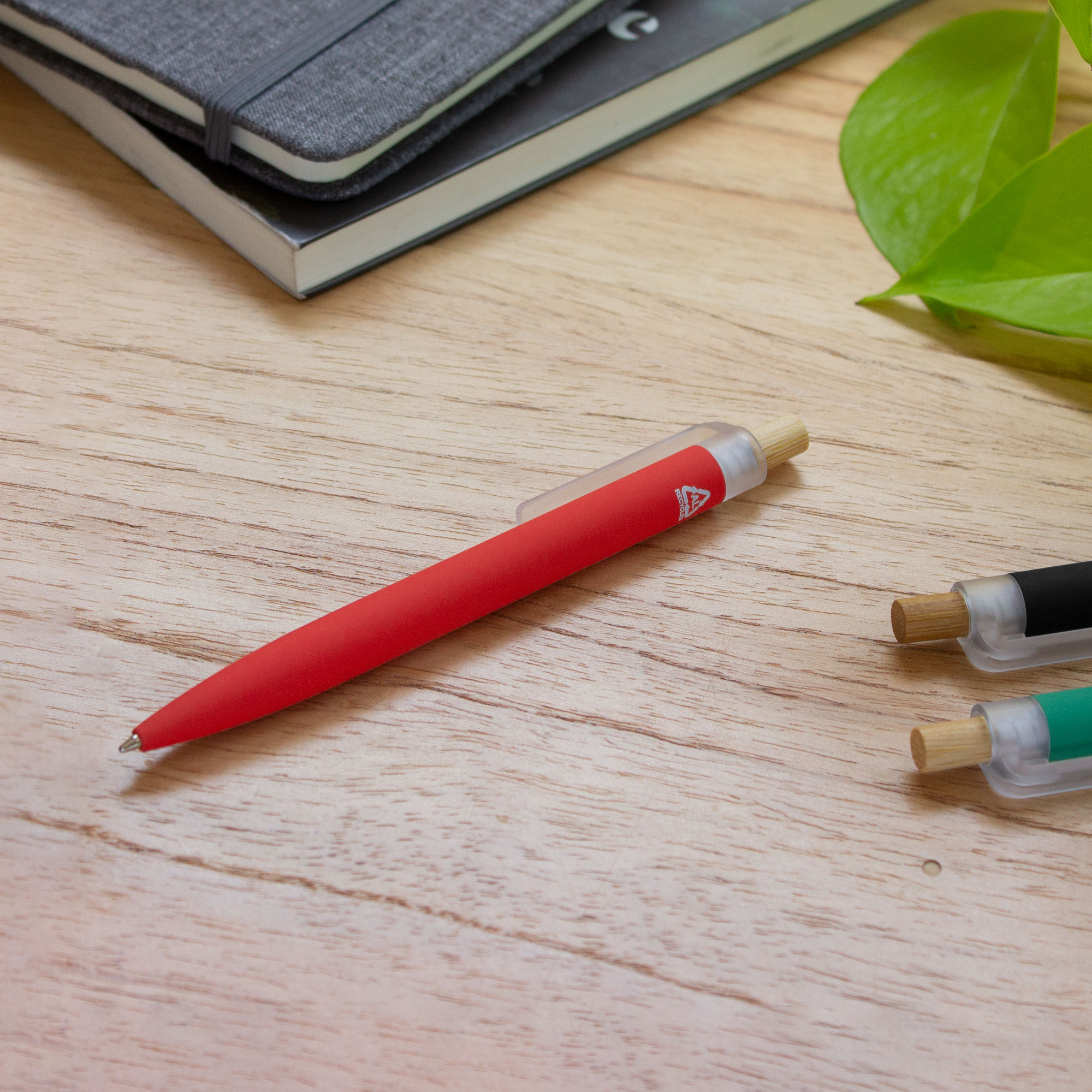 Bolígrafo retráctil. Cuerpo de aluminio en diferentes colores, acabado mate engomado, muy suave al tacto. Botón pulsador de bambú. Clip plástico transparente con terminación frosty.