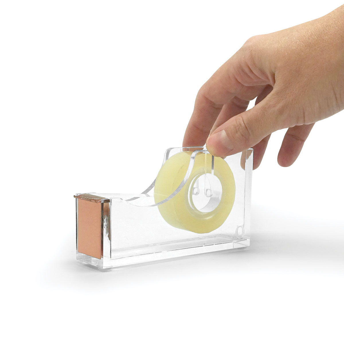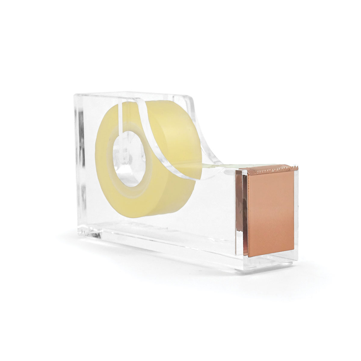 11,5 x 6,4 x 3 cm. Acrílico y metal rose gold. Dispensador de cinta adhesiva que combina diseño y funcionalidad para el día a día. Presentación en caja de regalo.
