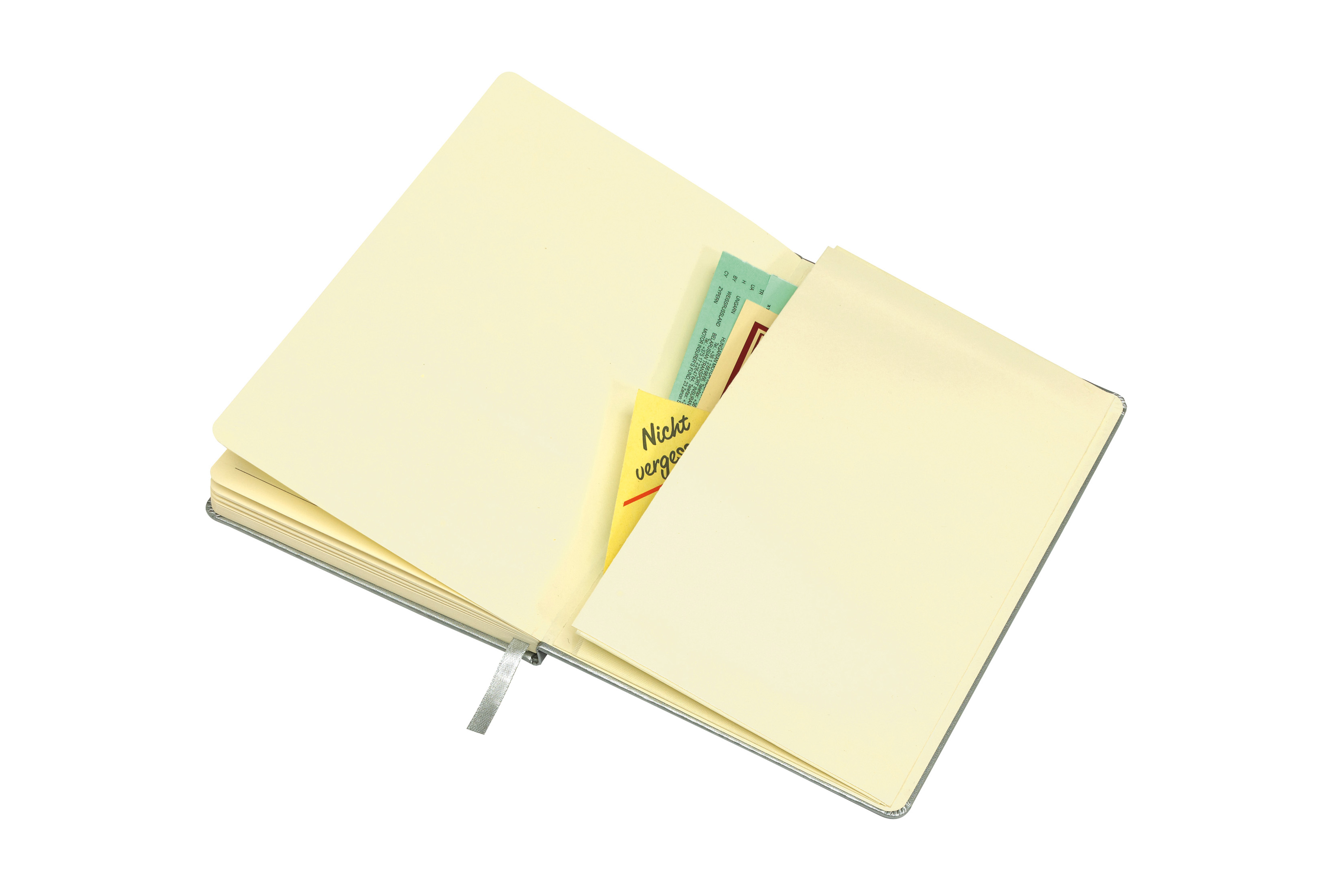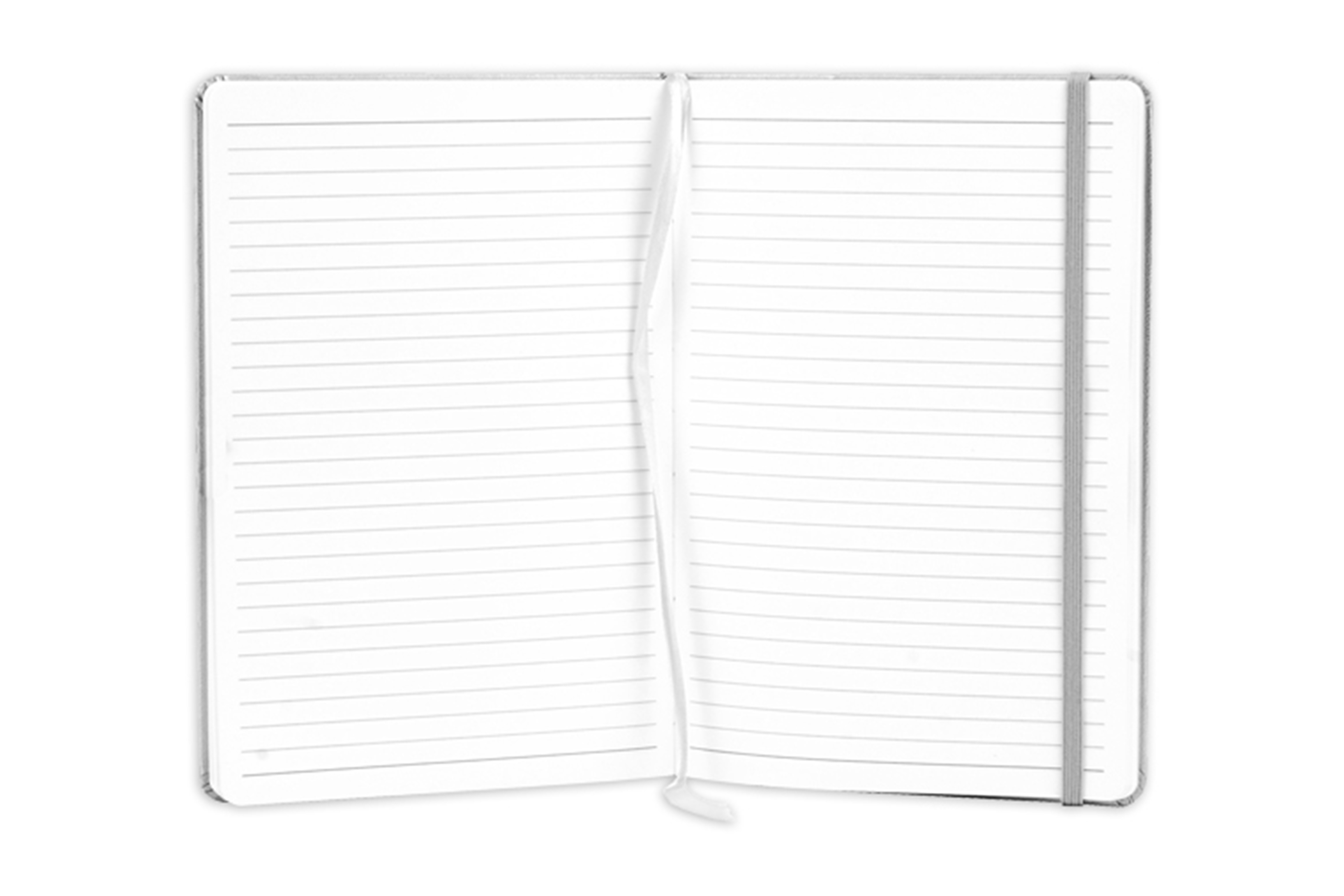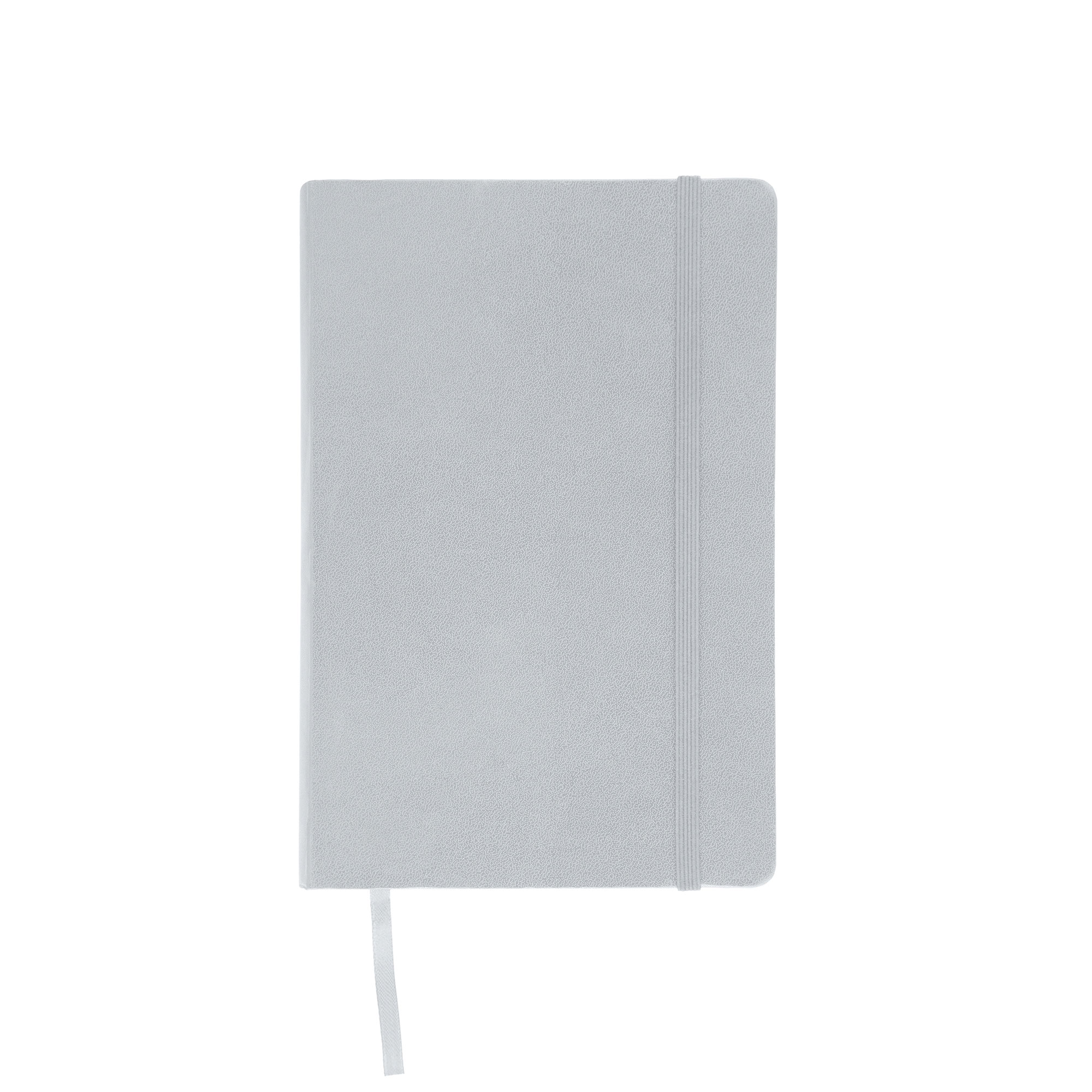 21 x 14 x 1,5 cm Cartón recubierto en poliuretano. 80 hojas rayadas.160 páginas.Separador de hojas en tela. Cierre con banda elástica. Bolsillo interior en la parte trasera de la libreta.