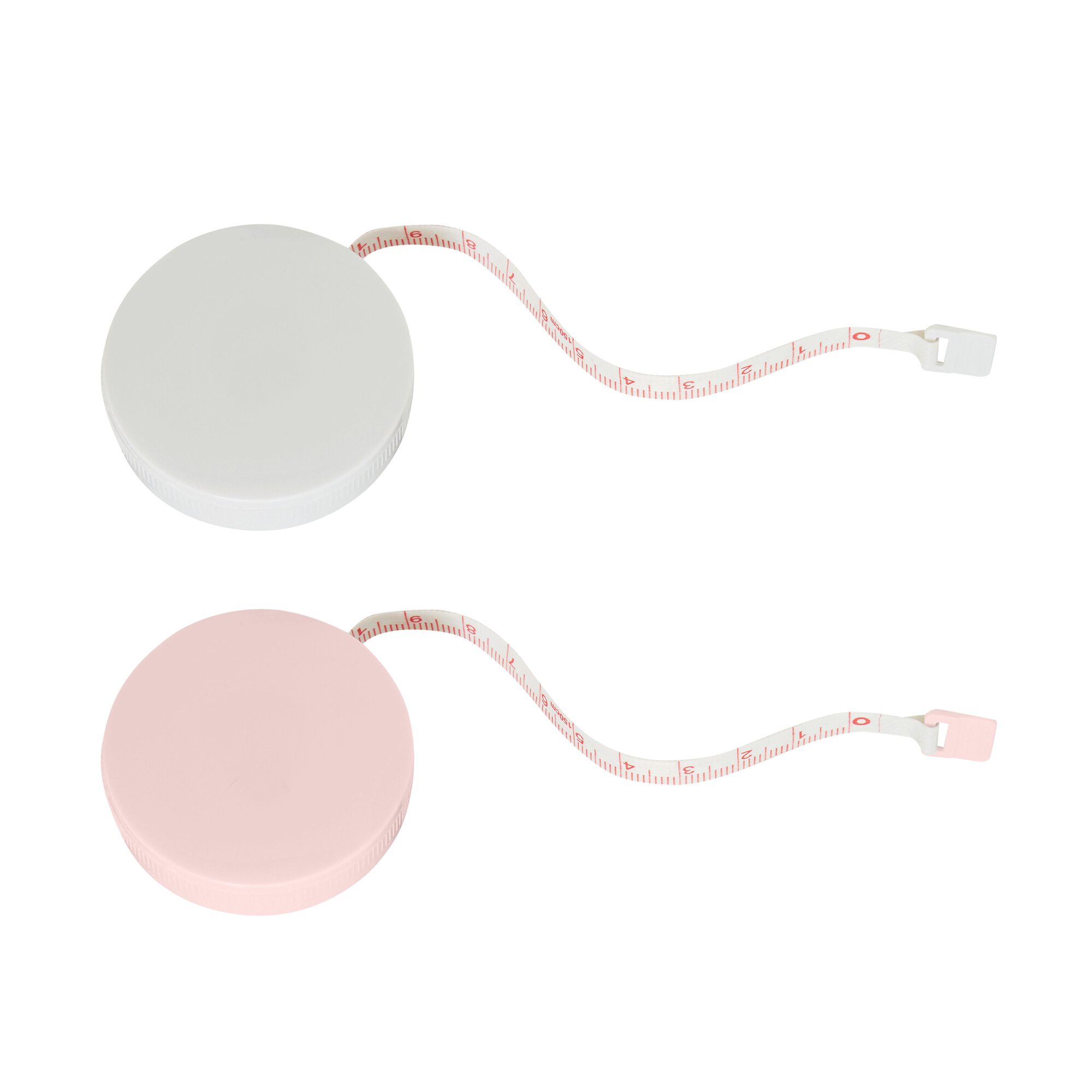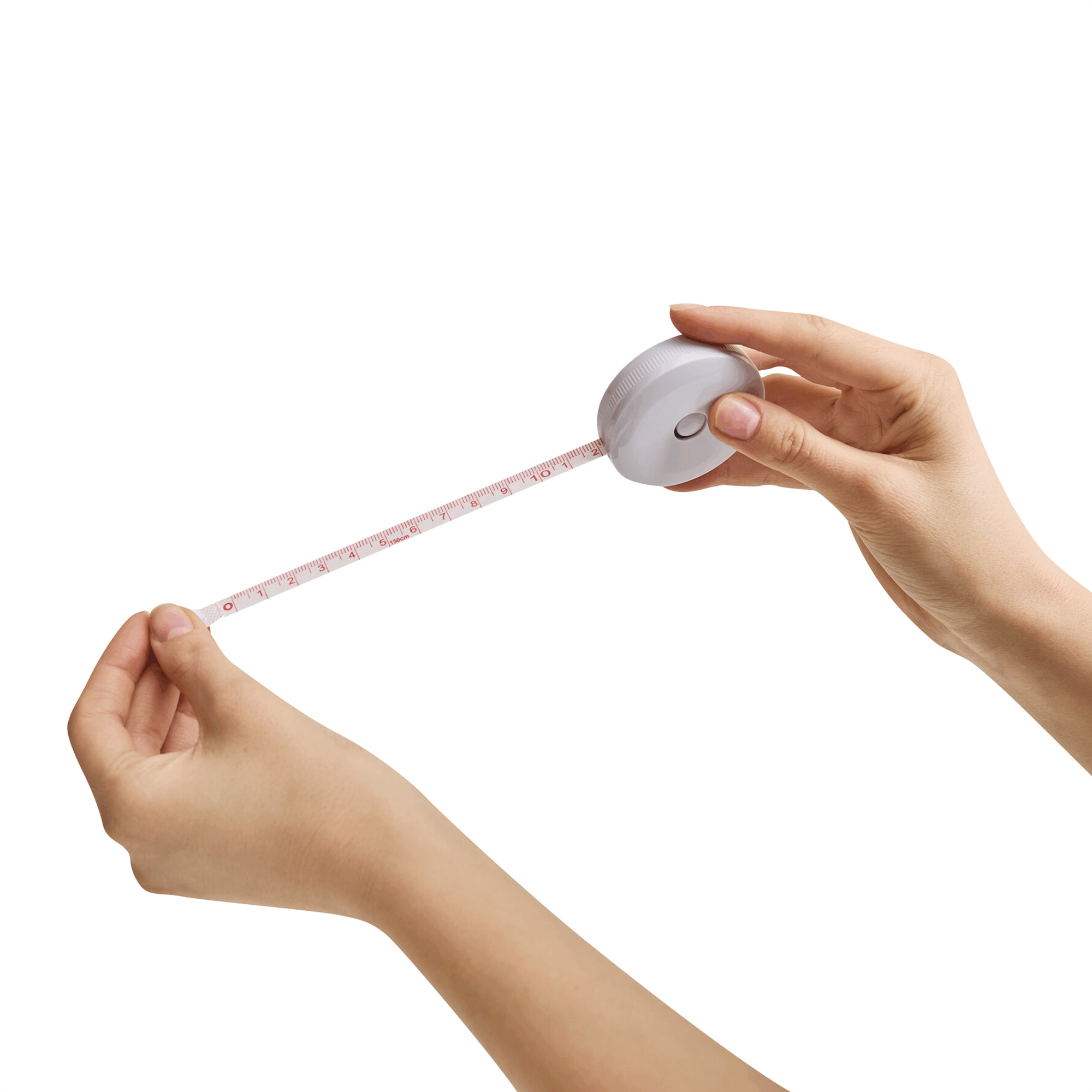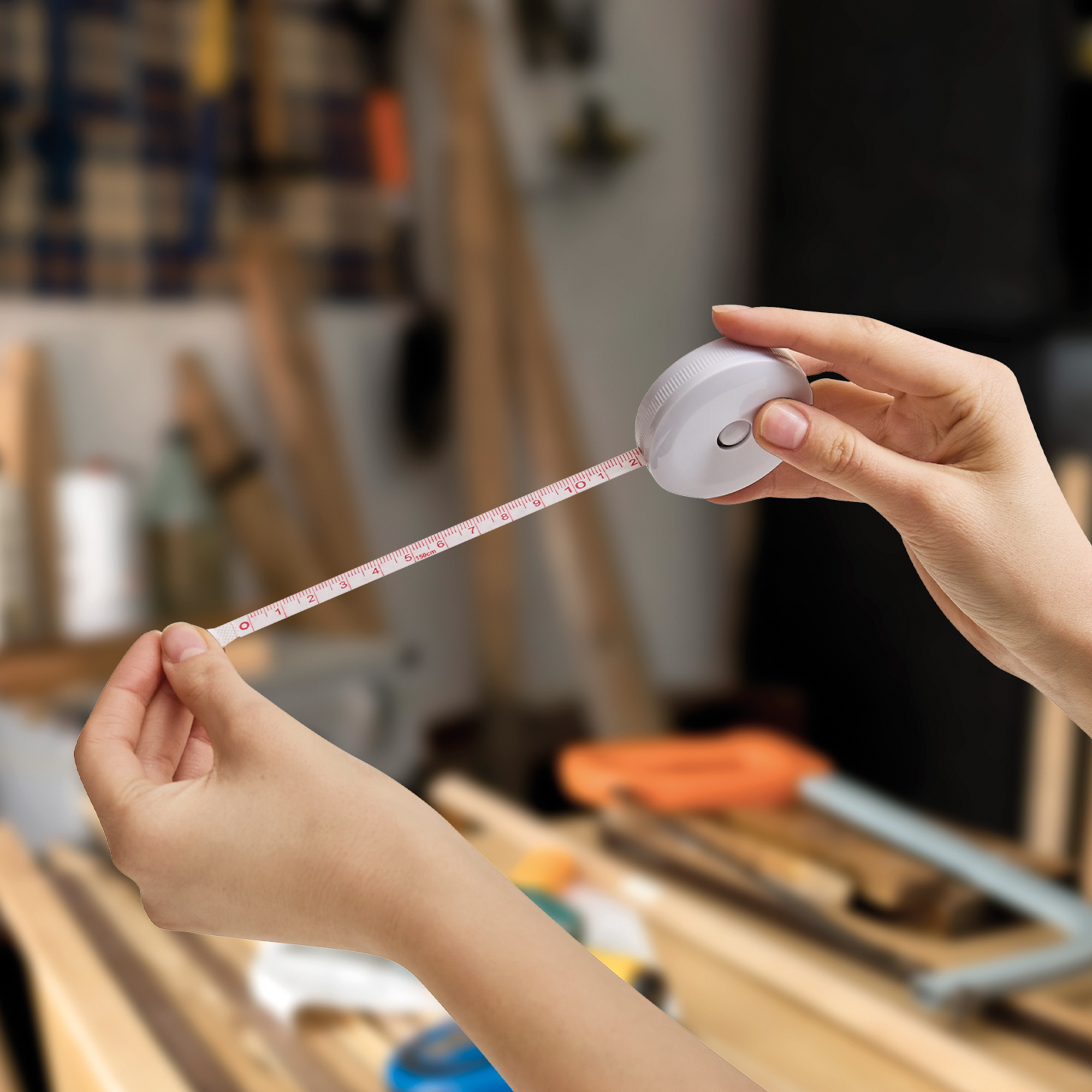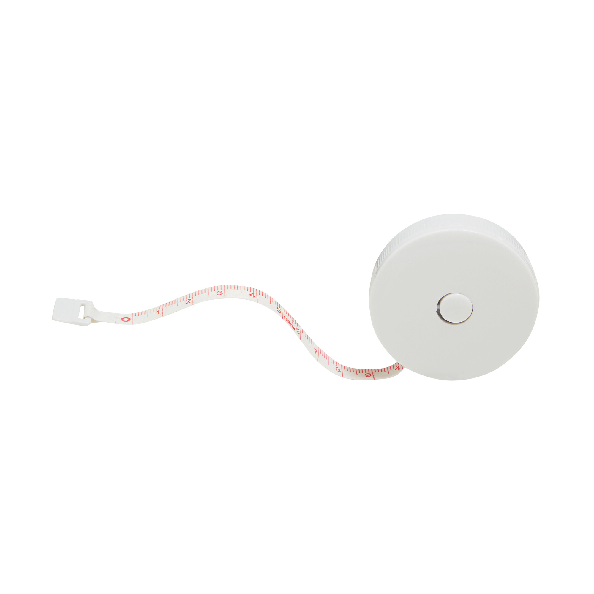 Ø 5 cm. huincha métrica de 1,5 m. Plástico. con botón de bloqueo que permite marcar medida y liberar cinta. Escala de medida en cm y pulgadas.
