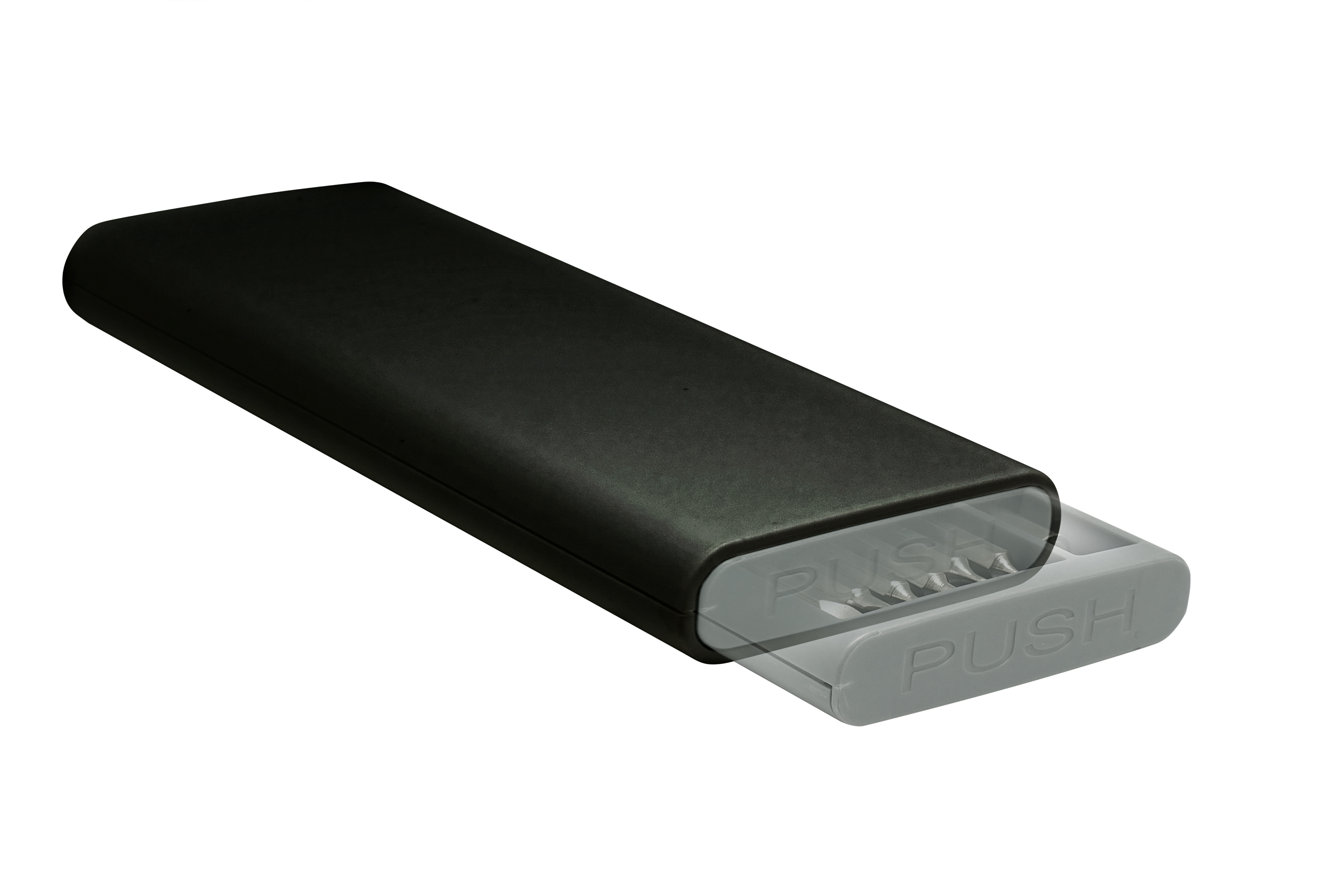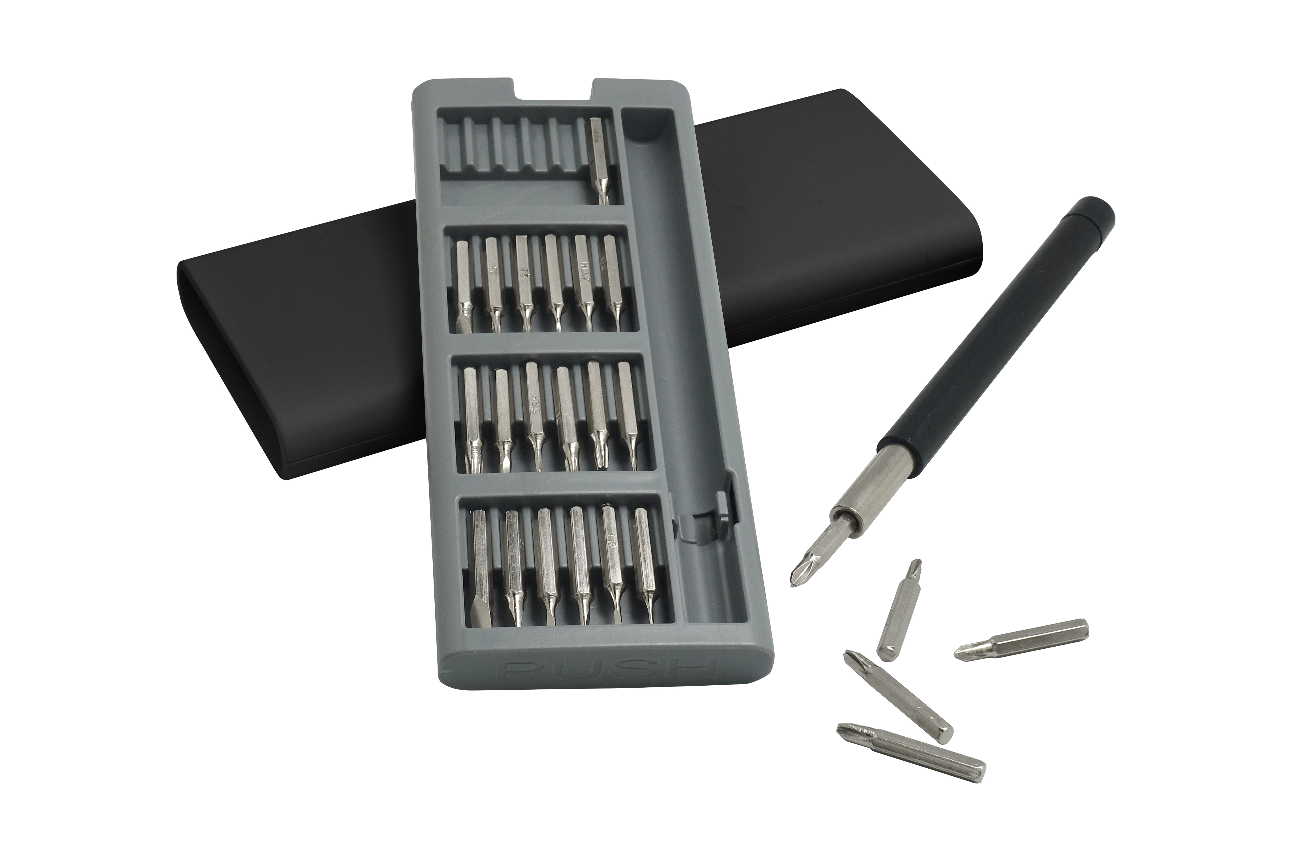 16,5 x 6,8 x 1,8 cm. Plástico y Acero.  Mango con punta imantada con 24 puntas diferentes. La caja viene con cuatro compartimentos imantados que permiten mantener ordenadas las diferentes puntas. La caja contiene apertura push.