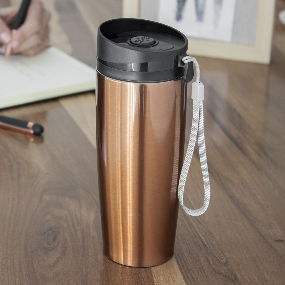 Ø 6 x 19,5 cm. Capacidad 350 ml. Acero inoxidable. Mug doble pared Interior acero 304 y exterior acero 201. Tapa a rosca, botón para abrir y cerrar. Lazo para sujetar en la muñeca. Base antideslizante. Mantiene las bebidas frías o calientes por más tiempo. Presentación en caja de regalo.