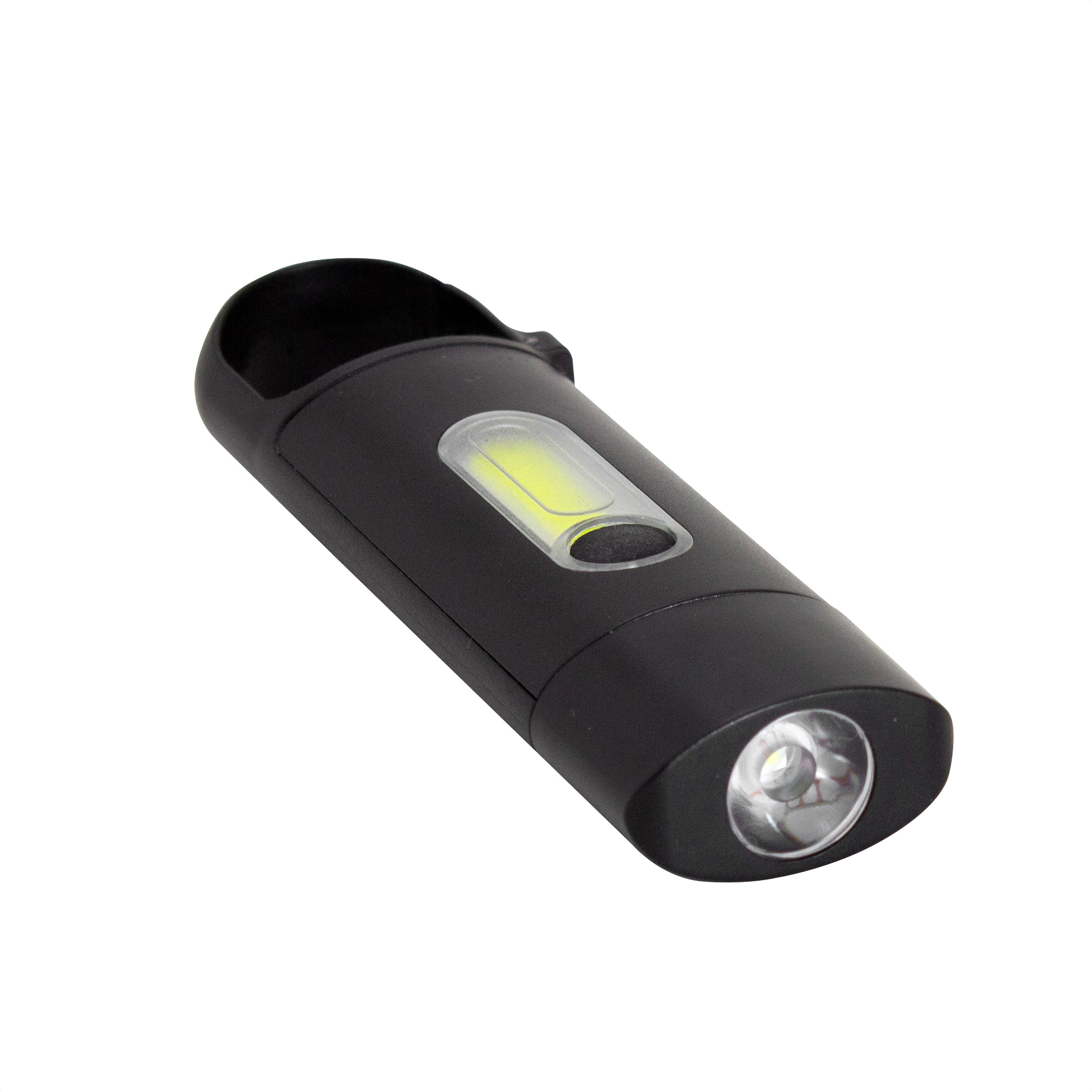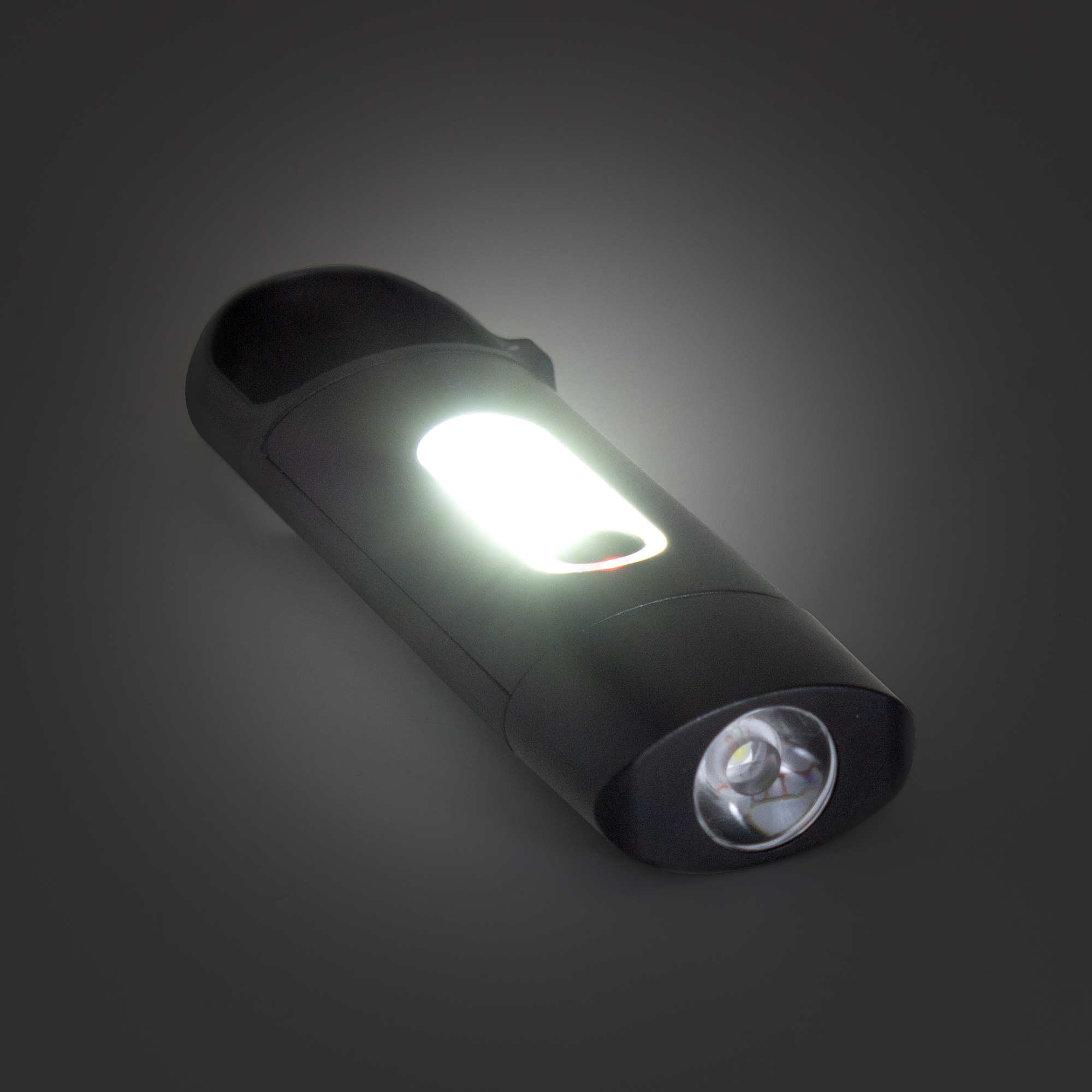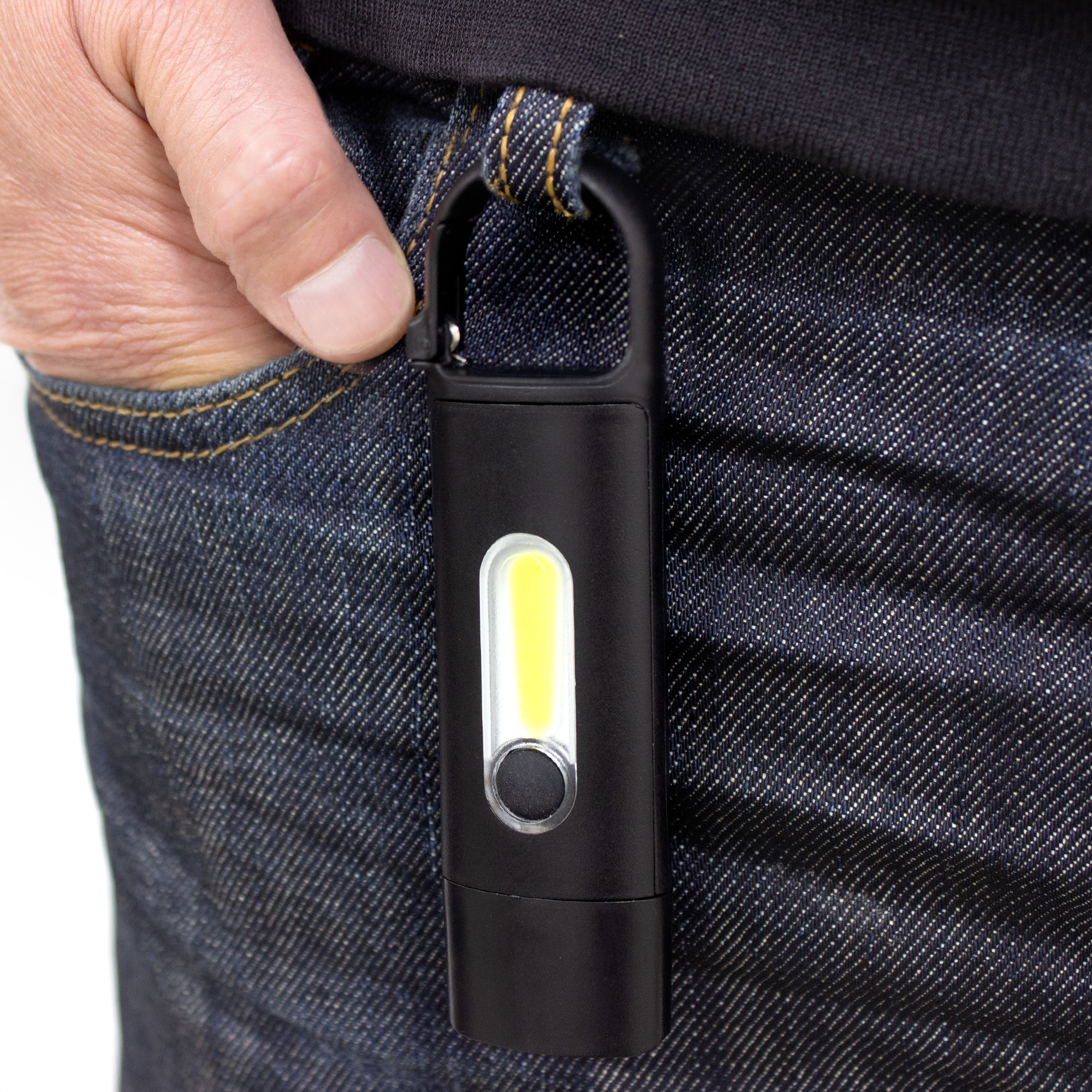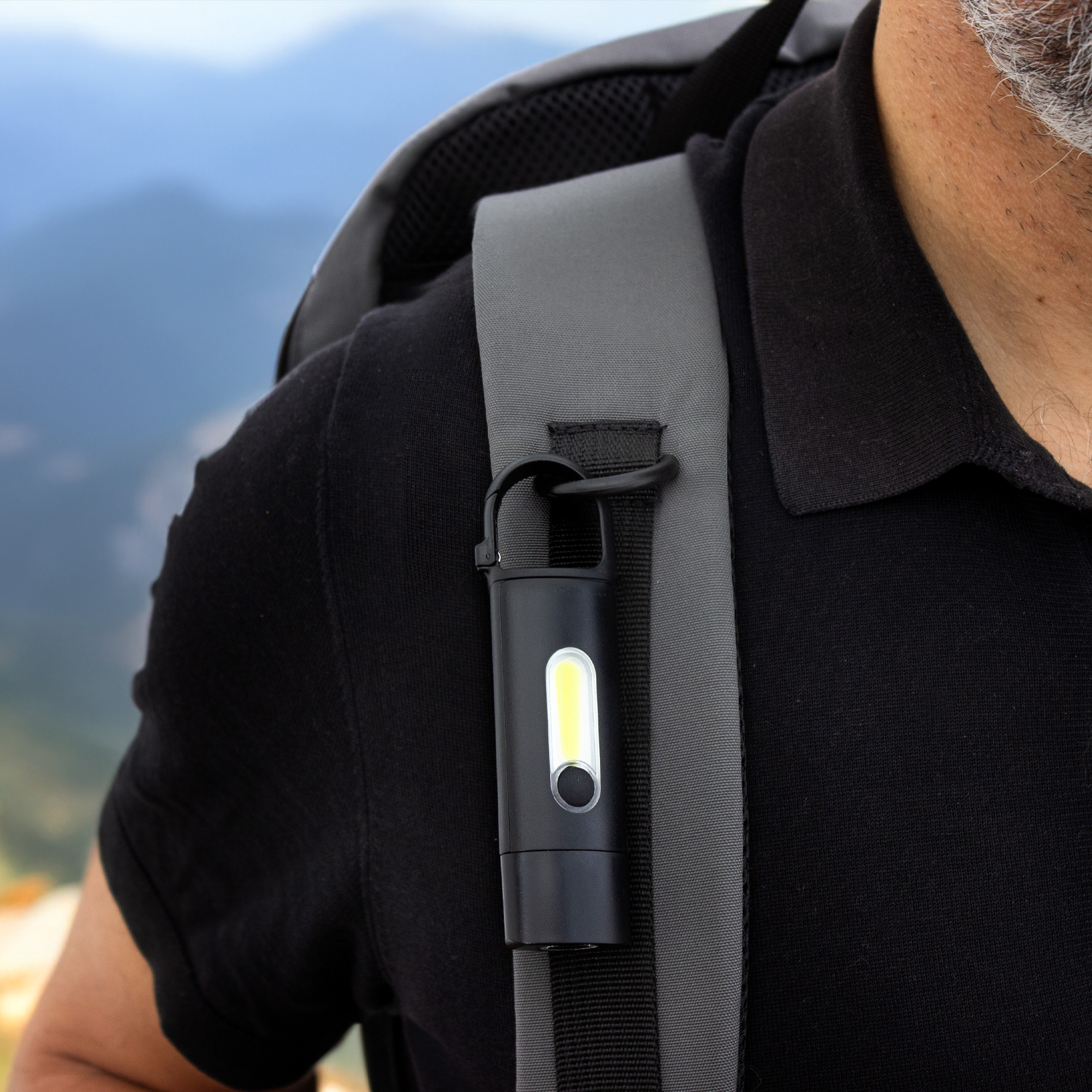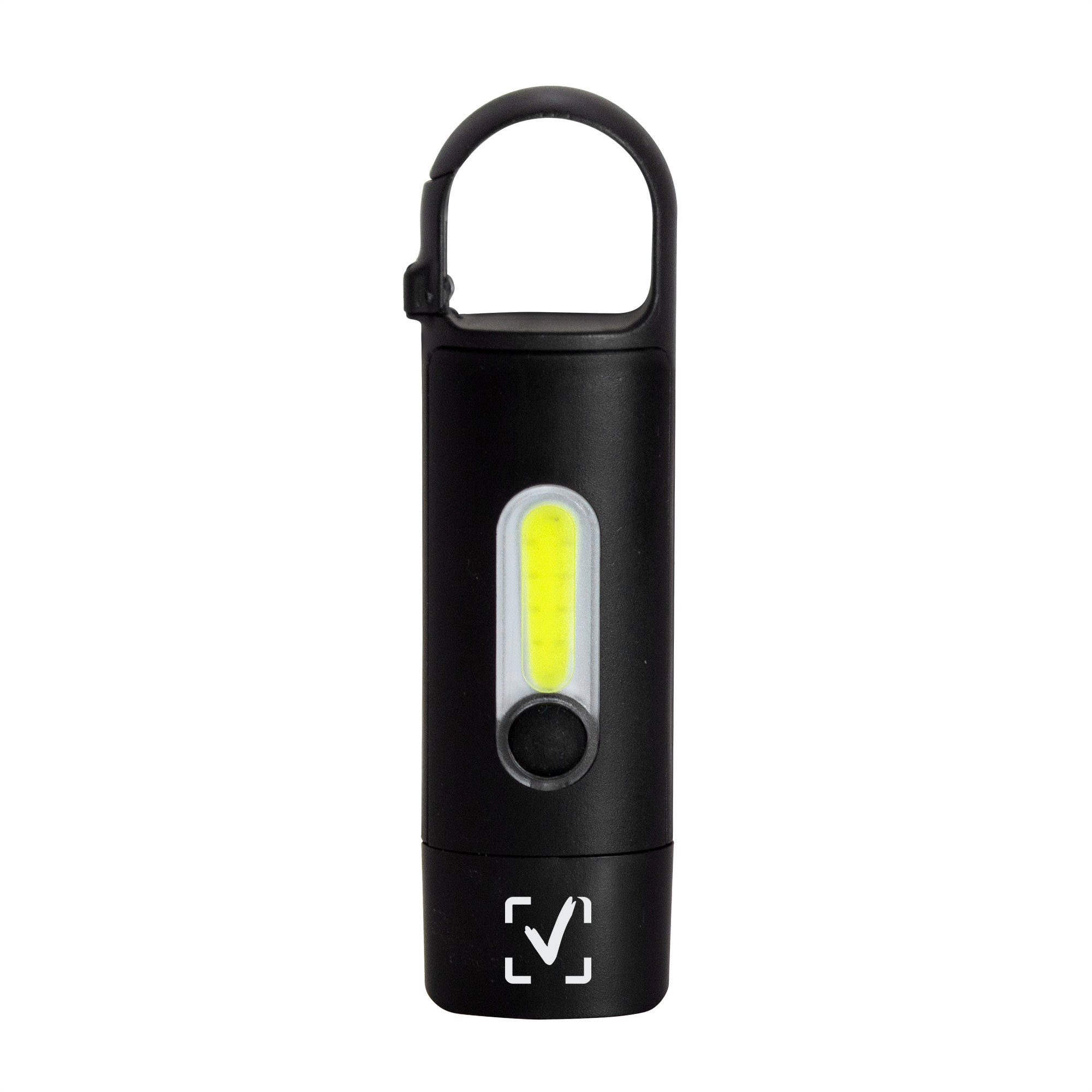Linterna portátil recargable. Con mosquetón incorporado. Luz de emergencia y 3 intensidades de iluminación (alta, baja e intermitente). Batería recargable de 200 mAh. Puerto USB-C y cable de carga de 30 cm de largo color negro.